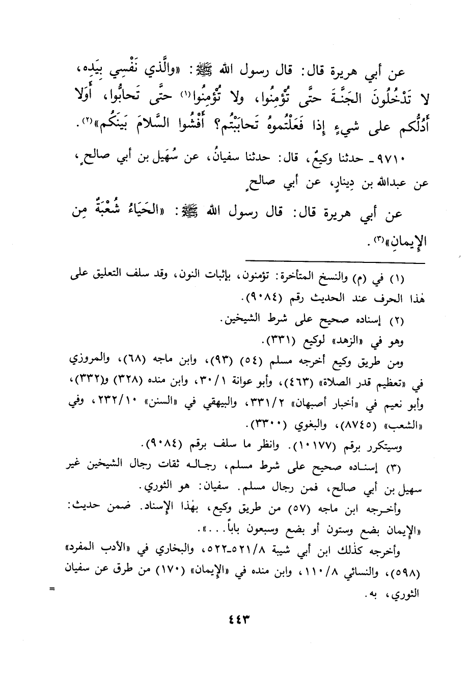 ٩٧١٠ - حَدَّثَنَا وَكِيعٌ، قَالَ: حَدَّثَنَا سُفْيَانُ، عَنْ سُهَيْلِ بْنِ أَبِي صَالِحٍ، عَنْ عَبْدِ اللهِ بْنِ دِينَارٍ، عَنْ أَبِي صَالِحٍ، عَنْ أَبِي هُرَيْرَةَ قَالَ: قَالَ رَسُولُ اللهِ صَلَّى اللهُ عَلَيْهِ وَسَلَّمَ: " الْحَيَاءُ شُعْبَةٌ مِنَ الْإِيمَانِ " (٣)