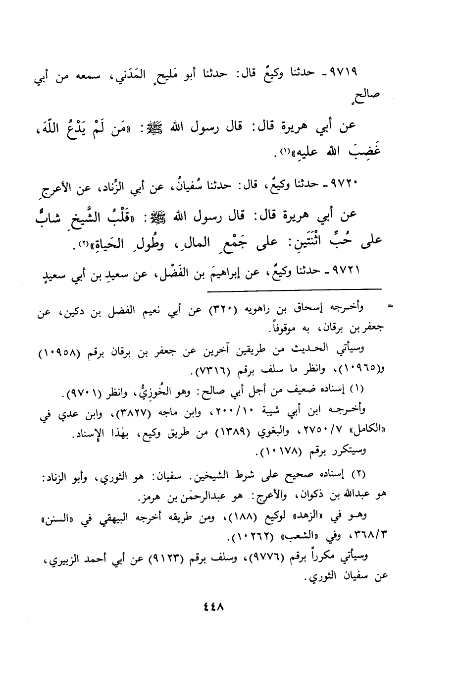 ٩٧٢٠ - حَدَّثَنَا وَكِيعٌ، قَالَ: حَدَّثَنَا سُفْيَانُ، عَنْ أَبِي الزِّنَادِ، عَنِ الْأَعْرَجِ، عَنْ أَبِي هُرَيْرَةَ، قَالَ: قَالَ رَسُولُ اللهِ صَلَّى اللهُ عَلَيْهِ وَسَلَّمَ: " قَلْبُ الشَّيْخِ شَابٌّ عَلَى حُبِّ اثْنَتَيْنِ: عَلَى جَمْعِ الْمَالِ، وَطُولِ الْحَيَاةِ " (٢)