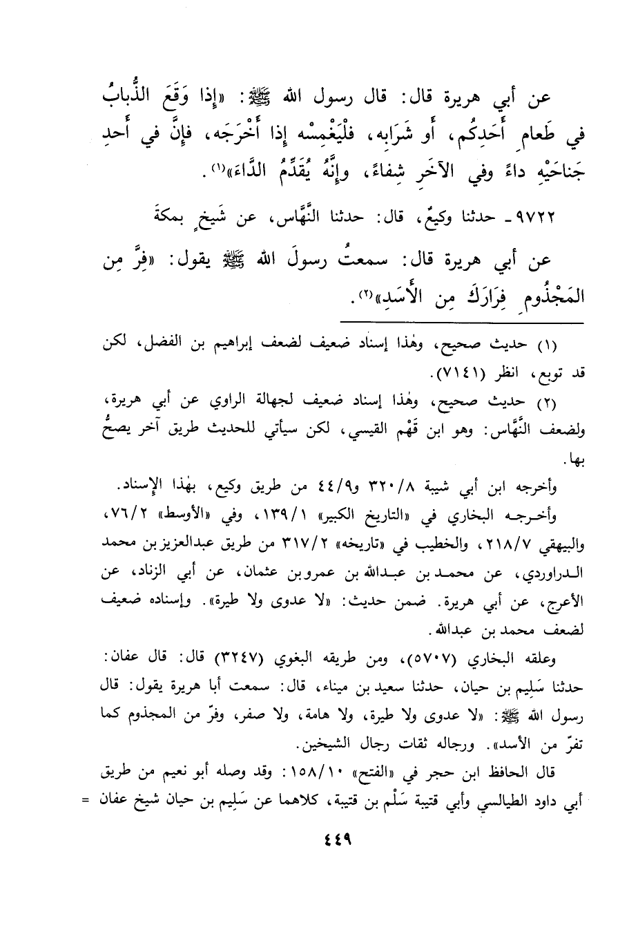 وعلقه البخاري (٥٧٠٧) ، ومن طريقه البغوي (٣٢٤٧) قال: قال عفان: حدثنا سَلِيم بن حنان، حدثنا سعيد بن ميناء، قال: سمعت أبا هريرة يقول: قال رسول الله صَلَّى اللهُ عَلَيْهِ وَسَلَّمَ: "لا عدوى ولا طيرة، ولا هامة، ولا صفر، وفر من المجذوم كما تفر من الأسد". ورجاله ثقات رجال الشيخين.