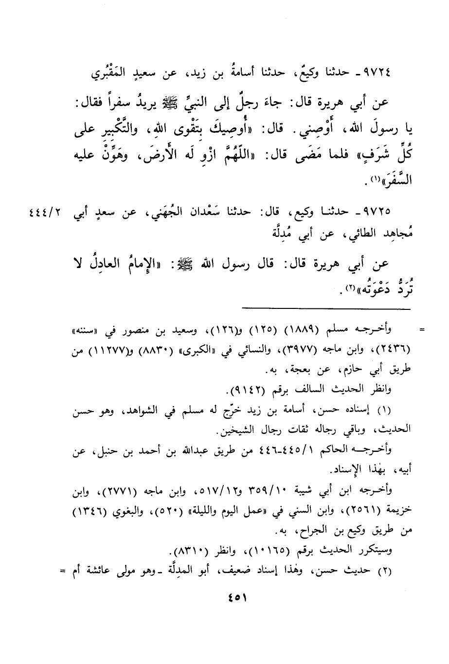 ٩٧٢٤ - حَدَّثَنَا وَكِيعٌ، حَدَّثَنَا أُسَامَةُ بْنُ زَيْدٍ، عَنْ سَعِيدٍ الْمَقْبُرِيِّ، عَنْ أَبِي هُرَيْرَةَ، قَالَ: جَاءَ رَجُلٌ إِلَى النَّبِيِّ صَلَّى اللهُ عَلَيْهِ وَسَلَّمَ يُرِيدُ سَفَرًا، فَقَالَ: يَا رَسُولَ اللهِ، أَوْصِنِي، قَالَ: " أُوصِيكَ بِتَقْوَى اللهِ، وَالتَّكْبِيرِ عَلَى كُلِّ شَرَفٍ "، فَلَمَّا مَضَى قَالَ: " اللهُمَّ ازْوِ لَهُ الْأَرْضَ، وَهَوِّنْ عَلَيْهِ السَّفَرَ " (١)