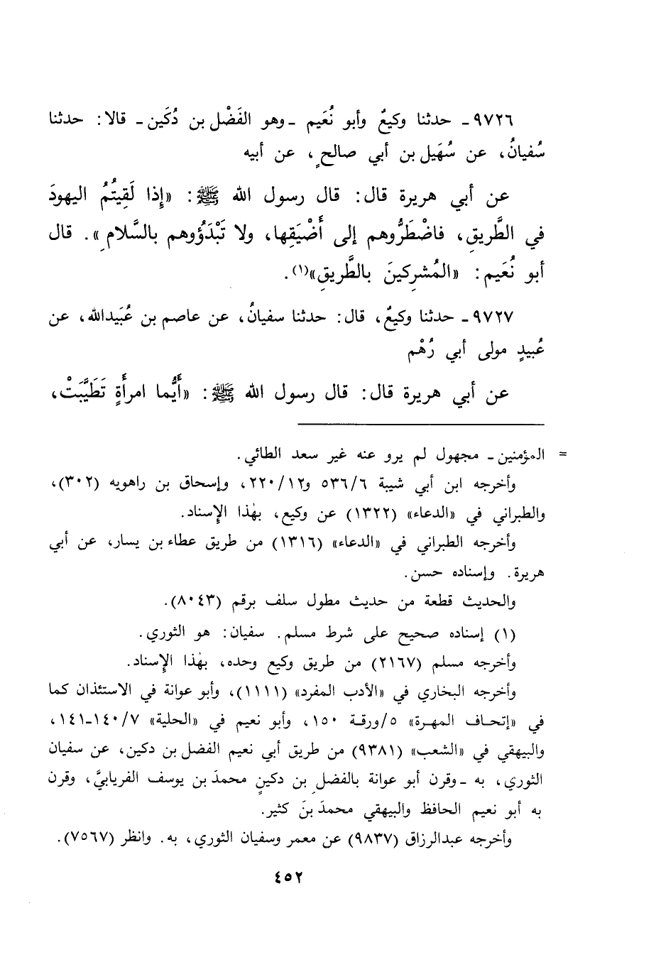٩٧٢٦ - حَدَّثَنَا وَكِيعٌ، وَأَبُو نُعَيْمٍ وَهُوَ الْفَضْلُ بْنُ دُكَيْنٍ، قَالَا: حَدَّثَنَا سُفْيَانُ، عَنْ سُهَيْلِ بْنِ أَبِي صَالِحٍ، عَنْ أَبِيهِ، عَنْ أَبِي هُرَيْرَةَ، قَالَ: قَالَ رَسُولُ اللهِ صَلَّى اللهُ عَلَيْهِ وَسَلَّمَ: " إِذَا لَقِيتُمُ الْيَهُودَ فِي الطَّرِيقِ، فَاضْطَرُّوهُمْ إِلَى أَضْيَقِهَا، وَلَا تَبْدَءُوهُمْ بِالسَّلَامِ "، قَالَ أَبُو نُعَيْمٍ: " الْمُشْرِكِينَ بِالطَّرِيقِ " (١)