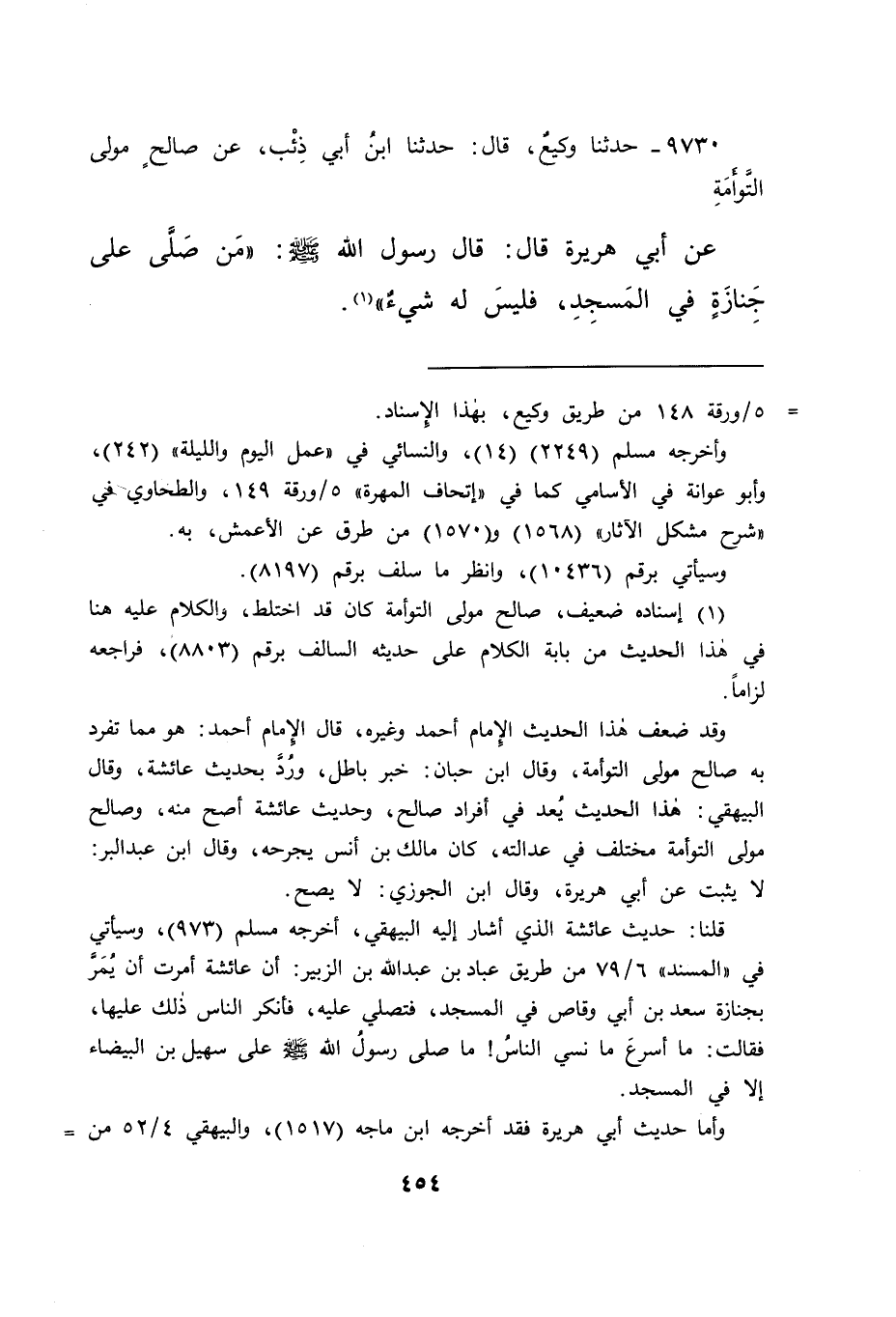 ٩٧٣٠ - حَدَّثَنَا وَكِيعٌ، قَالَ: حَدَّثَنَا ابْنُ أَبِي ذِئْبٍ، عَنْ صَالِحٍ، مَوْلَى التَّوْأَمَةِ، عَنْ أَبِي هُرَيْرَةَ، قَالَ: قَالَ رَسُولُ اللهِ صَلَّى اللهُ عَلَيْهِ وَسَلَّمَ: " مَنْ صَلَّى عَلَى جَنَازَةٍ فِي الْمَسْجِدِ، فَلَيْسَ لَهُ شَيْءٌ " (١)