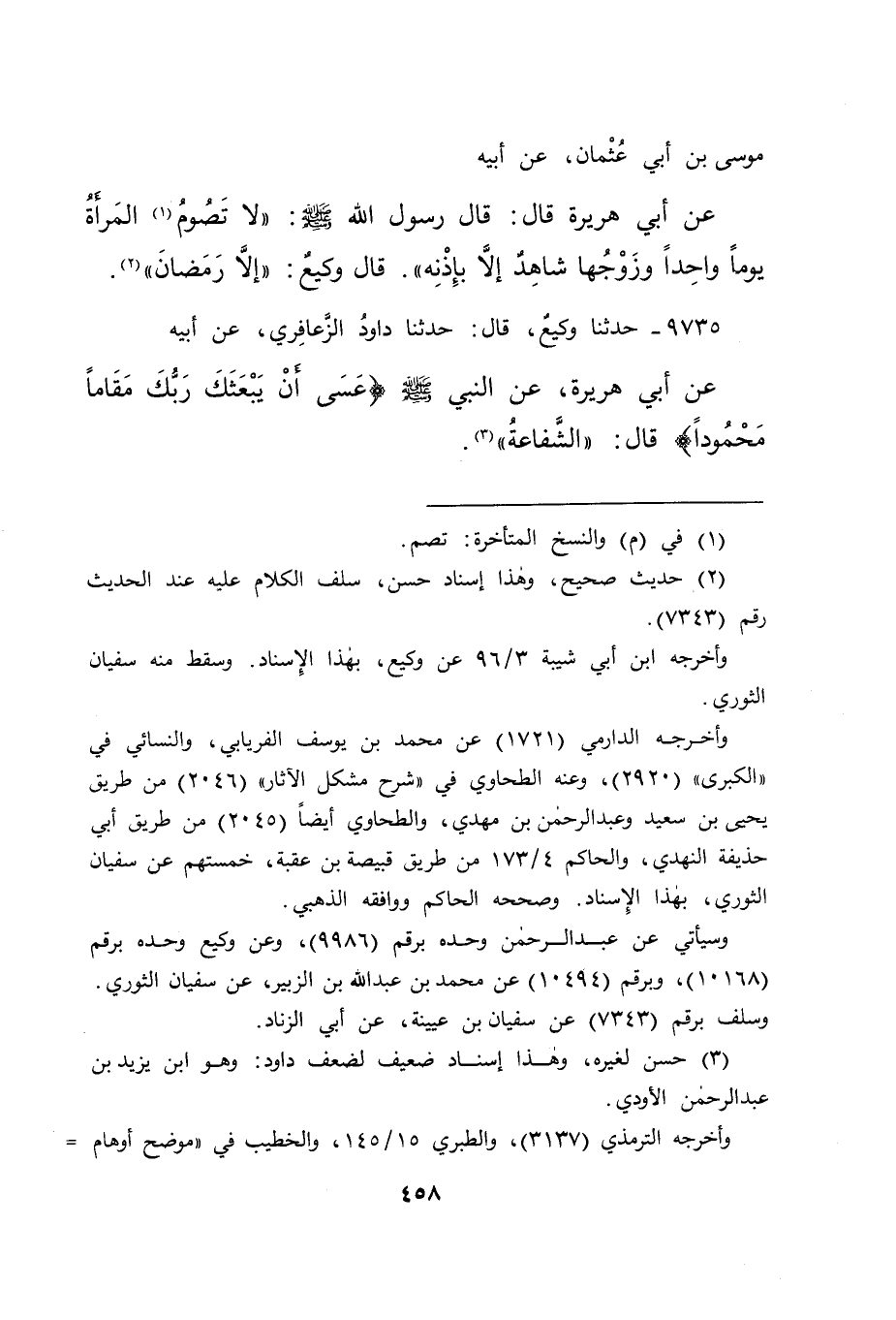 مُوسَى بْنِ أَبِي عُثْمَانَ، عَنْ أَبِيهِ، عَنْ أَبِي هُرَيْرَةَ، قَالَ: قَالَ رَسُولُ اللهِ صَلَّى اللهُ عَلَيْهِ وَسَلَّمَ: " لَا تَصُومُ (١) الْمَرْأَةُ يَوْمًا وَاحِدًا، وَزَوْجُهَا شَاهِدٌ إِلَّا بِإِذْنِهِ "، قَالَ وَكِيعٌ: إِلَّا رَمَضَانَ (٢)
