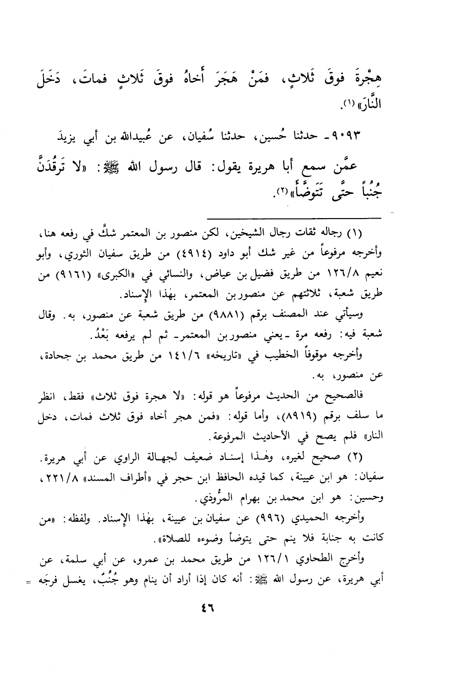 ٩٠٩٣ - حَدَّثَنَا حُسَيْنٌ، حَدَّثَنَا سُفْيَانُ، عَنْ عُبَيْدِ اللهِ بْنِ أَبِي يَزِيدَ، عَمَّنْ سَمِعَ أَبَا هُرَيْرَةَ، يَقُولُ: قَالَ رَسُولُ اللهِ صَلَّى اللهُ عَلَيْهِ وَسَلَّمَ: " لَا تَرْقُدَنَّ جُنُبًا حَتَّى تَتَوَضَّأَ " (٢)