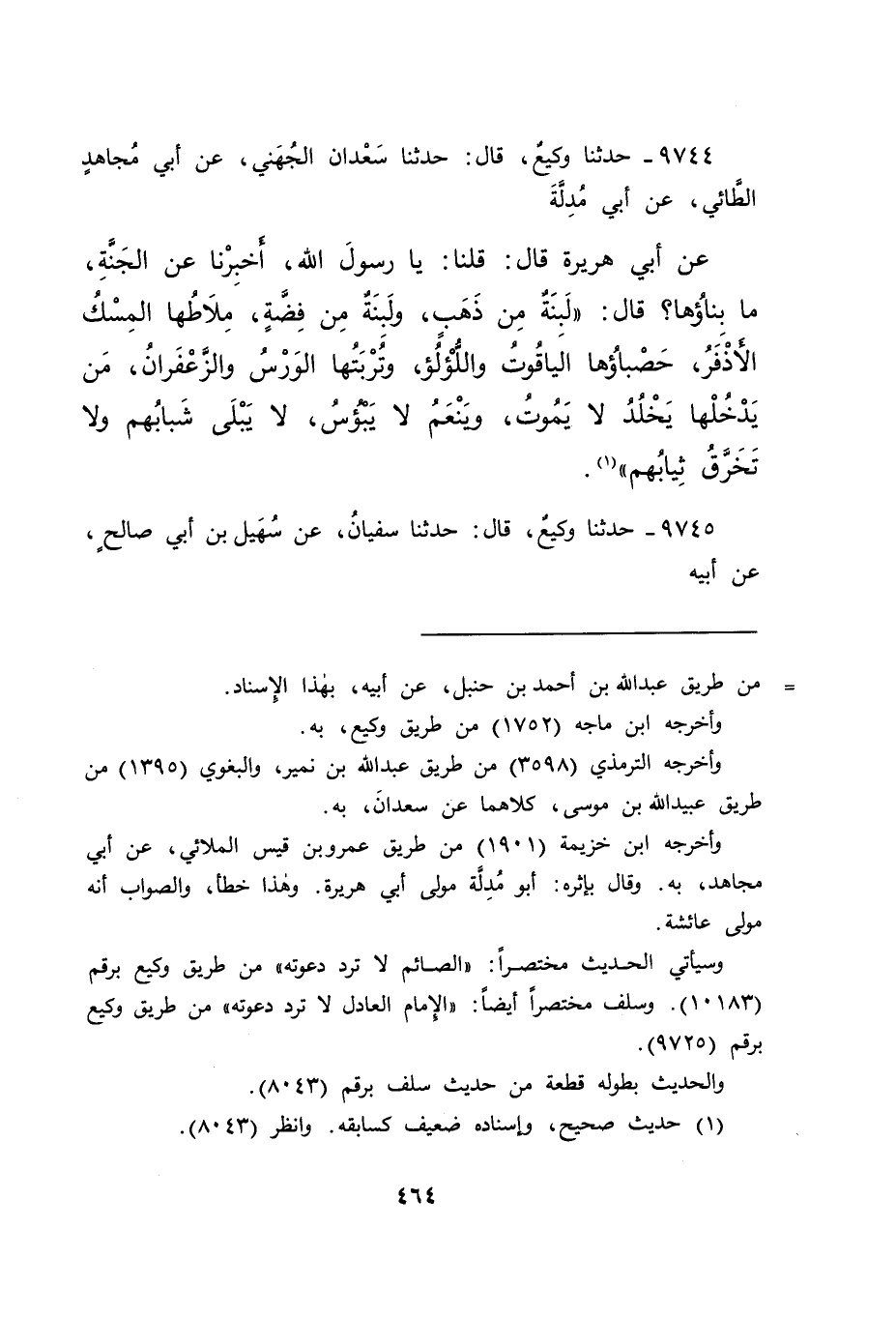 ٩٧٤٤ - حَدَّثَنَا وَكِيعٌ، قَالَ: حَدَّثَنَا سَعْدَانُ الْجُهَنِيُّ، عَنْ أَبِي مُجَاهِدٍ الطَّائِيِّ، عَنْ أَبِي مُدِلَّةَ، عَنْ أَبِي هُرَيْرَةَ، قَالَ: قُلْنَا: يَا رَسُولَ اللهِ، أَخْبِرْنَا عَنِ الْجَنَّةِ، مَا بِنَاؤُهَا؟ قَالَ: " لَبِنَةٌ مِنْ ذَهَبٍ، وَلَبِنَةٌ مِنْ فِضَّةٍ، مِلَاطُهَا الْمِسْكُ الْأَذْفَرُ، حَصْبَاؤُهَا الْيَاقُوتُ وَاللُّؤْلُؤُ، وَتُرْبَتُهَا الْوَرْسُ وَالزَّعْفَرَانُ، مَنْ يَدْخُلُهَا يَخْلُدُ لَا يَمُوتُ، وَيَنْعَمُ لَا يَبْأَسُ، لَا يَبْلَى شَبَابُهُمْ، وَلَا تُخَرَّقُ ثِيَابُهُمْ " (١)