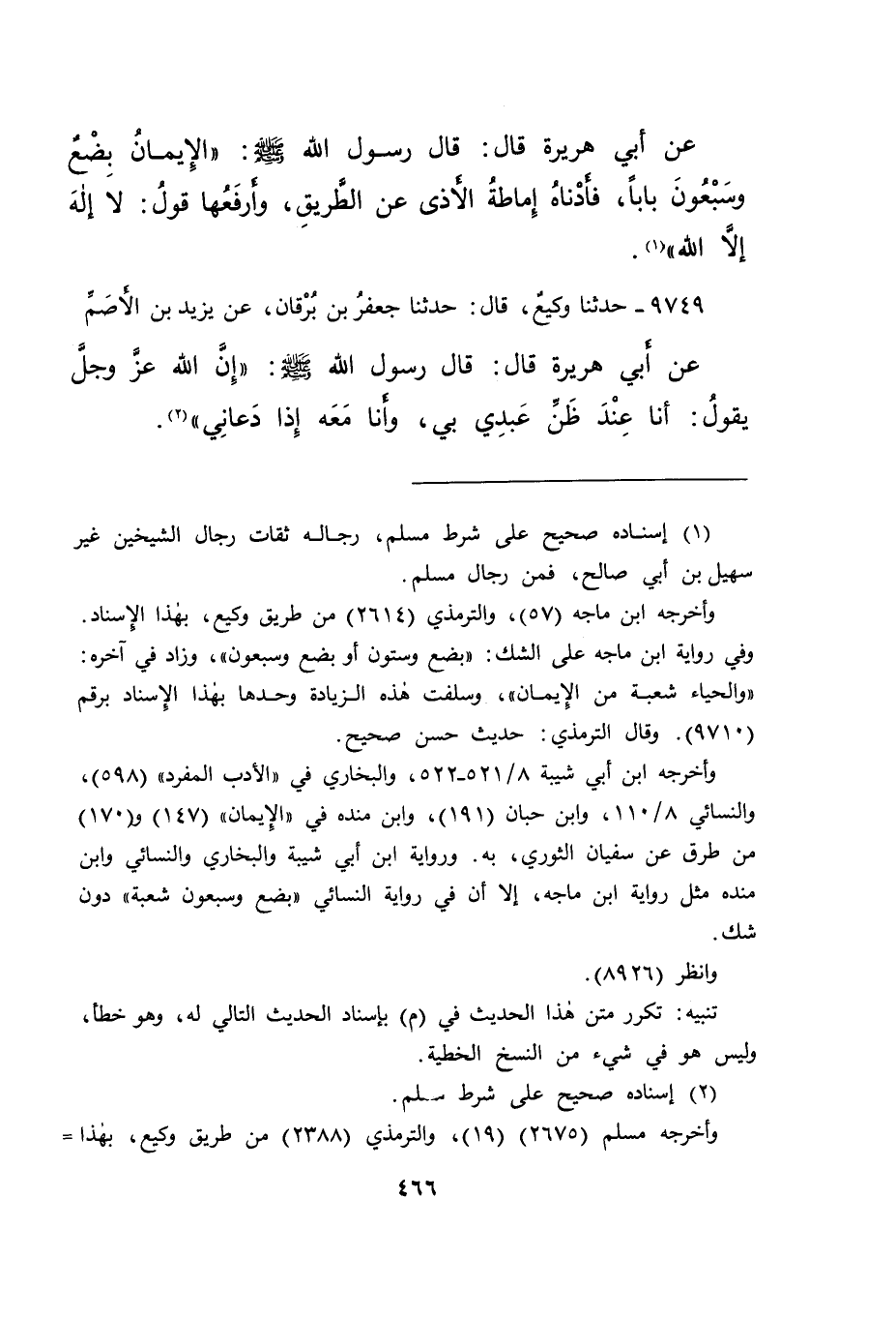 وفي رواية ابن ماجه على الشك: "بضع وستون أو بضع وسبعون"، وزاد في آخره: "والحياء شعبة من الإيمان"، وسلفت هذه الزيادة وحدها بهذا الإسناد برقم (٩٧١٠) . وقال الترمذي: حديث حسن صحيح.