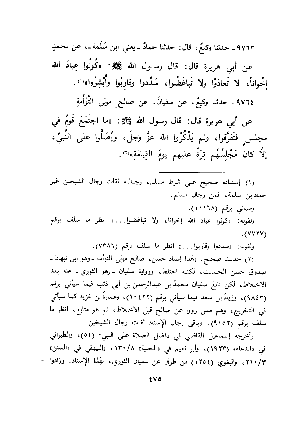 ٩٧٦٣ - حَدَّثَنَا وَكِيعٌ، قَالَ: حَدَّثَنَا حَمَّادٌ يَعْنِي ابْنَ سَلَمَةَ، عَنْ مُحَمَّدٍ، عَنْ أَبِي هُرَيْرَةَ، قَالَ: قَالَ رَسُولُ اللهِ صَلَّى اللهُ عَلَيْهِ وَسَلَّمَ: " كُونُوا عِبَادَ اللهِ إِخْوَانًا، لَا تَعَادَوْا، وَلَا تَبَاغَضُوا، سَدِّدُوا، وَقَارِبُوا، وَأَبْشِرُوا " (١)