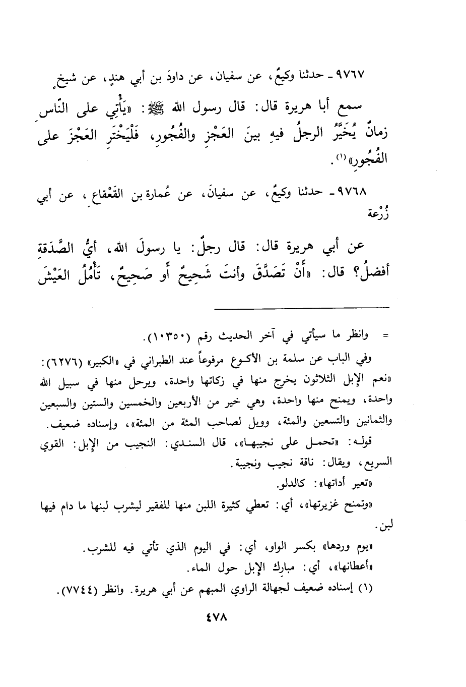 ٩٧٦٨ - حَدَّثَنَا وَكِيعٌ، عَنْ سُفْيَانَ، عَنْ عُمَارَةَ بْنِ الْقَعْقَاعِ، عَنْ أَبِي زُرْعَةَ، عَنْ أَبِي هُرَيْرَةَ، قَالَ: قَالَ: رَجُلٌ: يَا رَسُولَ اللهِ، أَيُّ الصَّدَقَةِ أَفْضَلُ؟ قَالَ: " أَنْ تَصَدَّقَ وَأَنْتَ شَحِيحٌ، أَوْ صَحِيحٌ، تَأْمُلُ الْعَيْشَ،