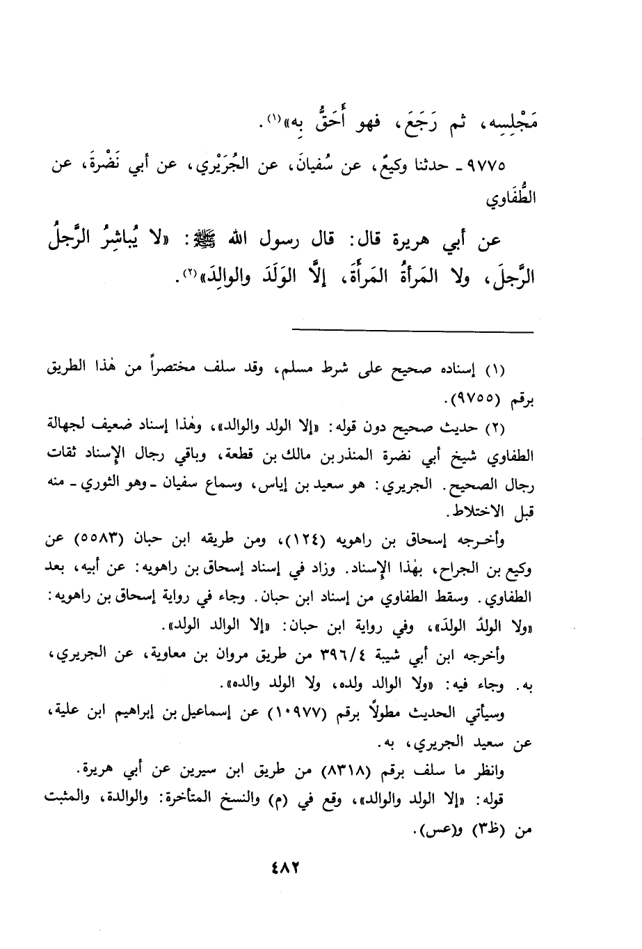 ٩٧٧٥ - حَدَّثَنَا وَكِيعٌ، عَنْ سُفْيَانَ، عَنِ الْجُرَيْرِيِّ، عَنْ أَبِي نَضْرَةَ، عَنِ الطُّفَاوِيِّ، عَنْ أَبِي هُرَيْرَةَ، قَالَ: قَالَ رَسُولُ اللهِ صَلَّى اللهُ عَلَيْهِ وَسَلَّمَ: " لَا يُبَاشِرُ الرَّجُلُ الرَّجُلَ، وَلَا الْمَرْأَةُ الْمَرْأَةَ، إِلَّا الْوَلَدَ وَالْوَالِدَ " (٢)