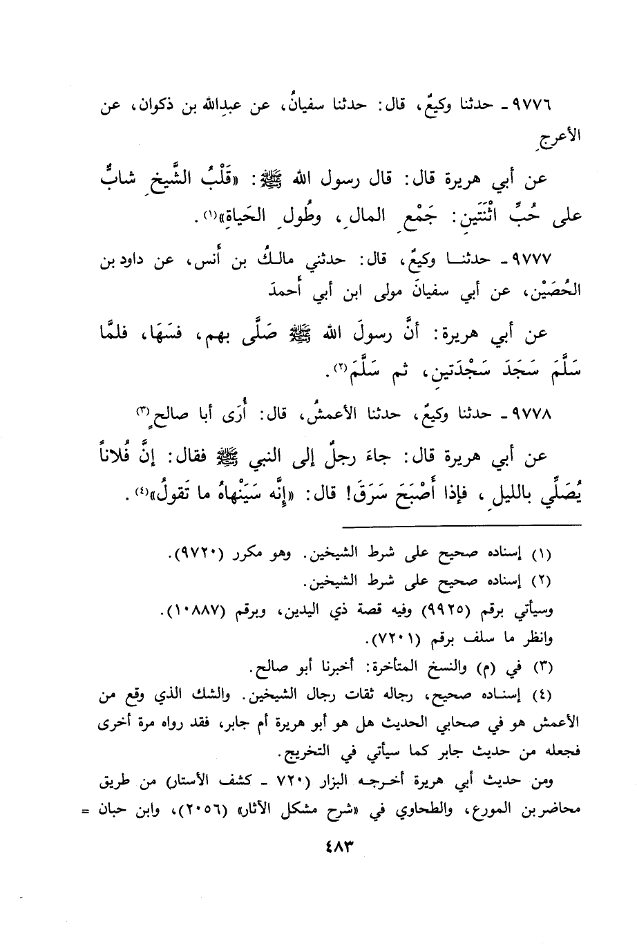 (٤) إسناده صحيح، رجاله ثقات رجال الشيخين. والشك الذي وقع من الأعمش هو في صحابي الحديث هل هو أبو هريرة أم جابر، فقد رواه مرة أخرى فجعله من حديث جابر كما سيأتي في التخريج.