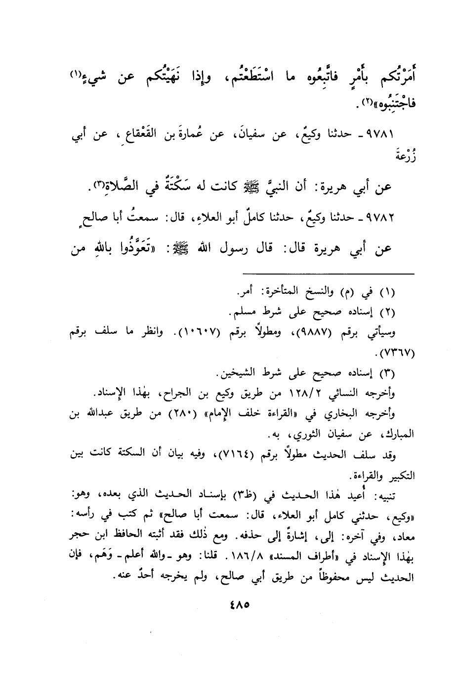 ٩٧٨١ - حَدَّثَنَا وَكِيعٌ، عَنْ سُفْيَانَ، عَنْ عُمَارَةَ بْنِ الْقَعْقَاعِ، عَنْ أَبِي زُرْعَةَ، عَنْ أَبِي هُرَيْرَةَ، " أَنَّ النَّبِيَّ صَلَّى اللهُ عَلَيْهِ وَسَلَّمَ، كَانَ لَهُ سَكْتَةٌ فِي الصَّلَاةِ " (٣)