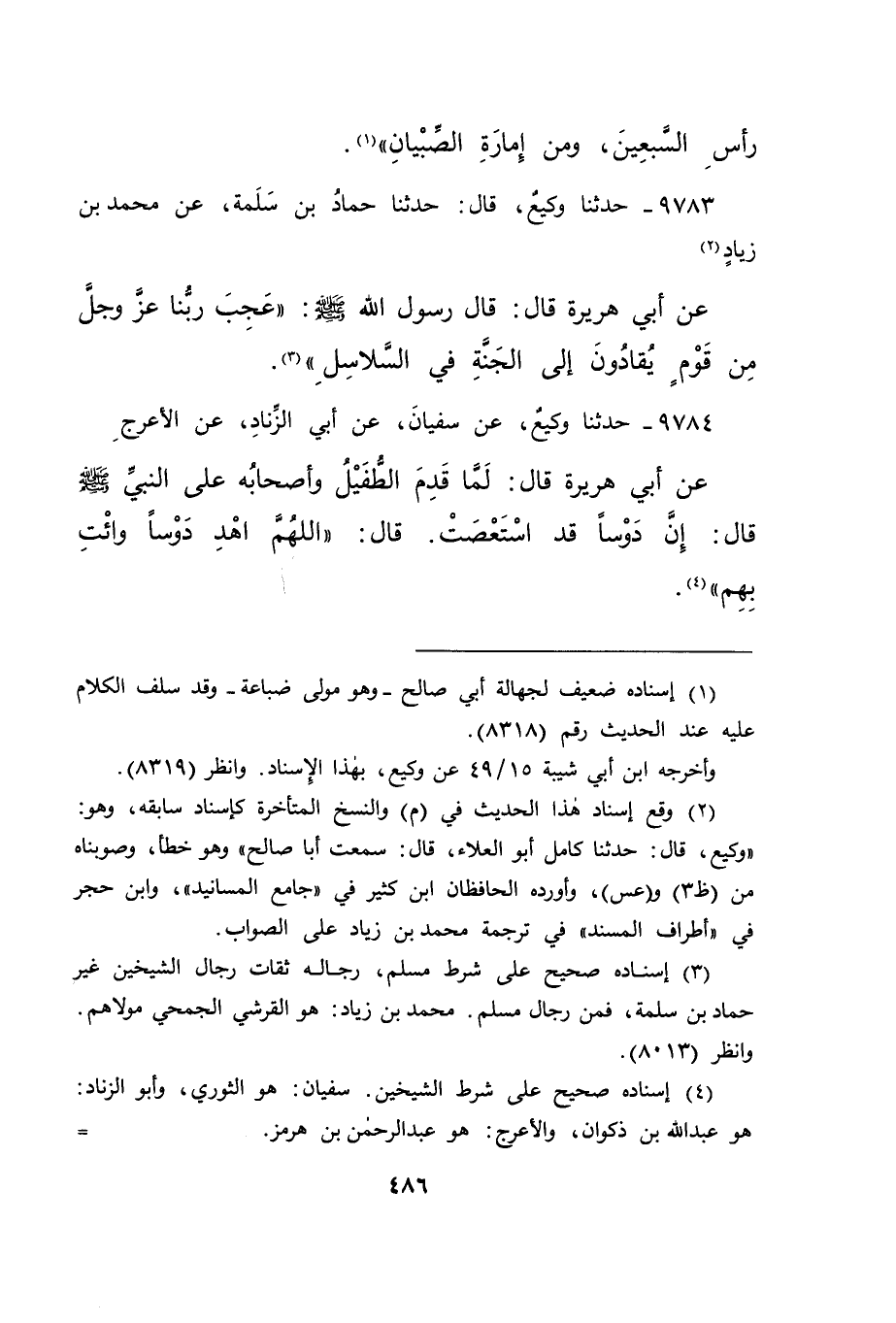 ٩٧٨٣ - حَدَّثَنَا وَكِيعٌ، قَالَ: حَدَّثَنَا حَمَّادُ بْنُ سَلَمَةَ، عَنْ مُحَمَّدِ بْنِ زِيَادٍ، (٢) عَنْ أَبِي هُرَيْرَةَ، قَالَ: قَالَ رَسُولُ اللهِ صَلَّى اللهُ عَلَيْهِ وَسَلَّمَ: " عَجِبَ رَبُّنَا عَزَّ وَجَلَّ مِنْ قَوْمٍ يُقَادُونَ إِلَى الْجَنَّةِ فِي السَّلَاسِلِ " (٣)