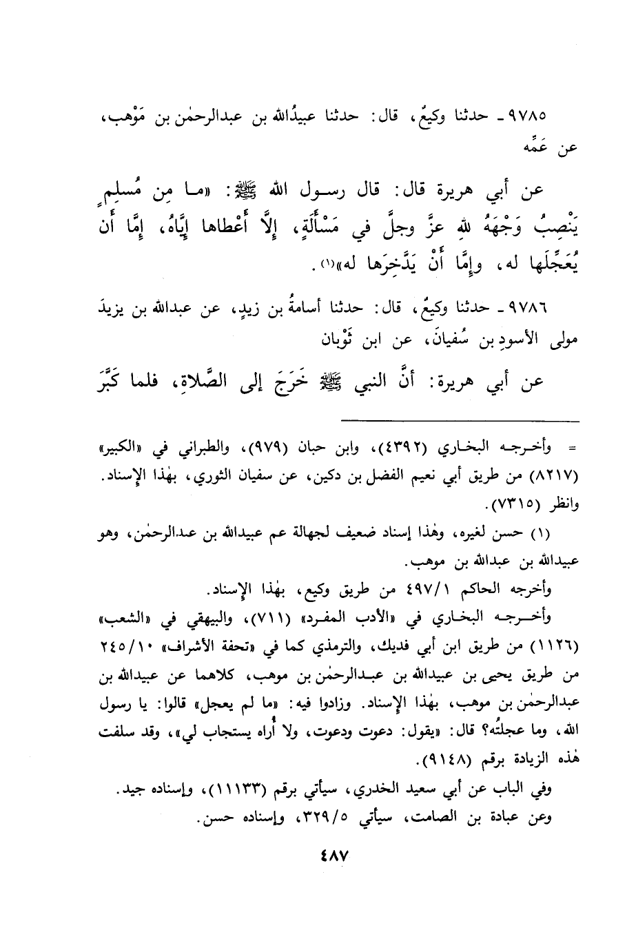 ٩٧٨٥ - حَدَّثَنَا وَكِيعٌ، قَالَ: حَدَّثَنَا عُبَيْدُ اللهِ بْنُ عَبْدِ الرَّحْمَنِ بْنِ مَوْهَبٍ، عَنْ عَمِّهِ عَنْ أَبِي هُرَيْرَةَ، قَالَ: قَالَ رَسُولُ اللهِ صَلَّى اللهُ عَلَيْهِ وَسَلَّمَ: " مَا مِنْ مُسْلِمٍ يَنْصِبُ وَجْهَهُ لِلَّهِ عَزَّ وَجَلَّ فِي مَسْأَلَةٍ، إِلَّا أَعْطَاهَا إِيَّاهُ، إِمَّا أَنْ يُعَجِّلَهَا لَهُ، وَإِمَّا أَنْ يَدَّخِرَهَا لَهُ " (١)