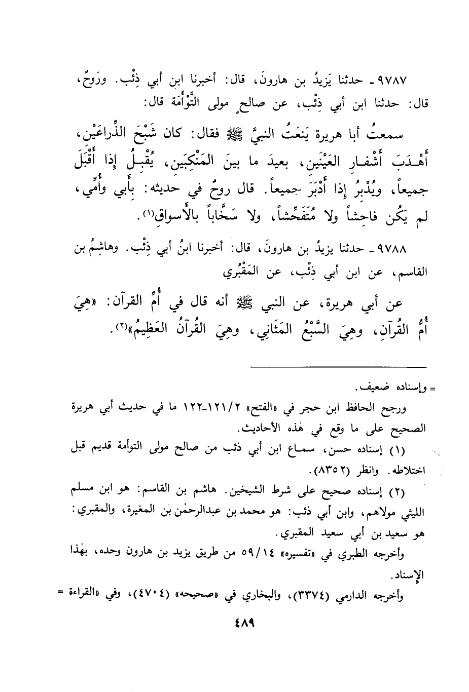 ٩٧٨٨ - حَدَّثَنَا يَزِيدُ بْنُ هَارُونَ، قَالَ: أَخْبَرَنَا ابْنُ أَبِي ذِئْبٍ، وَهَاشِمُ بْنُ الْقَاسِمِ، عَنِ ابْنِ أَبِي ذِئْبٍ، عَنِ الْمَقْبُرِيِّ، عَنْ أَبِي هُرَيْرَةَ، عَنِ النَّبِيِّ صَلَّى اللهُ عَلَيْهِ وَسَلَّمَ أَنَّهُ قَالَ: فِي أُمِّ الْقُرْآنِ: " هِيَ أُمُّ الْقُرْآنِ، وَهِيَ السَّبْعُ الْمَثَانِي، وَهِيَ الْقُرْآنُ الْعَظِيمُ " (٢)