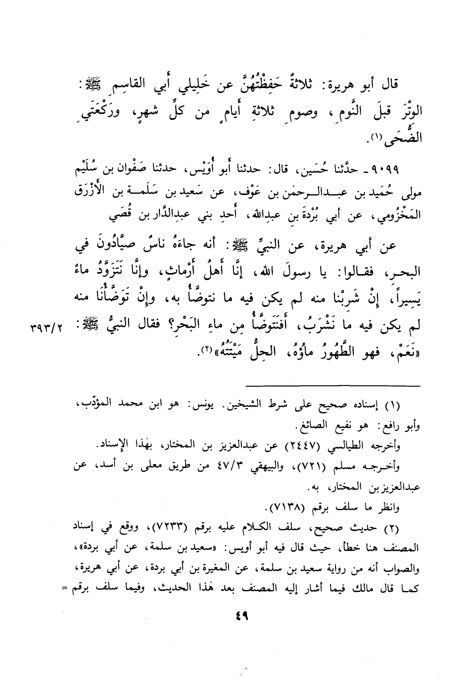 ٩٠٩٩ - حَدَّثَنَا حُسَيْنٌ، قَالَ: حَدَّثَنَا أَبُو أُوَيْسٍ، حَدَّثَنَا صَفْوَانُ بْنُ سُلَيْمٍ، مَوْلَى حُمَيْدِ بْنِ عَبْدِ الرَّحْمَنِ بْنِ عَوْفٍ، عَنْ سَعِيدِ بْنِ سَلَمَةَ بْنِ الْأَزْرَقِ الْمَخْزُومِيِّ، عَنْ الْمُغِيرَةِ بْنِ أَبِي بُرْدَةَ، أَحَدِ بَنِي عَبْدِ الدَّارِ بْنِ قُصَيٍّ، عَنْ أَبِي هُرَيْرَةَ، عَنِ النَّبِيِّ صَلَّى اللهُ عَلَيْهِ وَسَلَّمَ، أَنَّهُ جَاءَهُ نَاسٌ صَيَّادُونَ فِي الْبَحْرِ، فَقَالُوا: يَا رَسُولَ اللهِ، إِنَّا أَهْلُ أَرْمَاثٍ، وَإِنَّا نَتَزَوَّدُ مَاءً يَسِيرًا، إِنْ شَرِبْنَا مِنْهُ لَمْ يَكُنْ فِيهِ مَا نَتَوَضَّأُ بِهِ، وَإِنْ تَوَضَّأْنَا مِنْهُ لَمْ يَكُنْ فِيهِ مَا نَشْرَبُ، أَفَنَتَوَضَّأُ مِنْ مَاءِ الْبَحْرِ؟ فَقَالَ النَّبِيُّ صَلَّى اللهُ عَلَيْهِ وَسَلَّمَ: " نَعَمْ، فَهُوَ الطَّهُورُ مَاؤُهُ، الْحِلُّ مَيْتَتُهُ "، (٢)