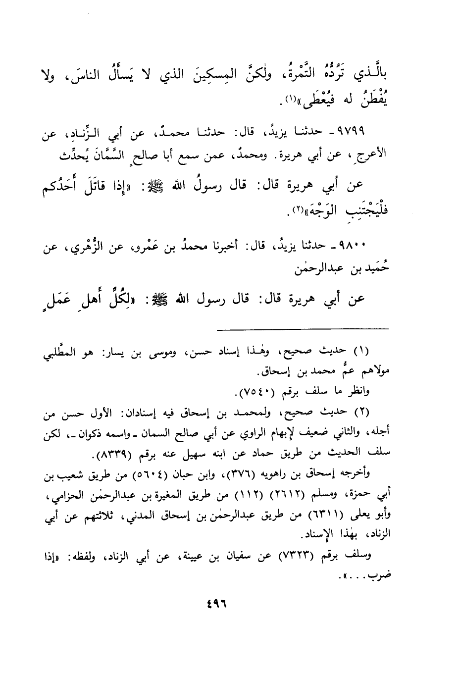 ٩٧٩٩ - حَدَّثَنَا يَزِيدُ، قَالَ: حَدَّثَنَا مُحَمَّدٌ، عَنْ أَبِي الزِّنَادِ، عَنِ الْأَعْرَجِ، عَنْ أَبِي هُرَيْرَةَ، وَمُحَمَّدٌ، عَمَّنْ سَمِعَ أَبَا صَالِحٍ السَّمَّانَ، يُحَدِّثُ عَنْ أَبِي هُرَيْرَةَ، قَالَ: قَالَ رَسُولُ اللهِ صَلَّى اللهُ عَلَيْهِ وَسَلَّمَ: " إِذَا قَاتَلَ أَحَدُكُمْ فَلْيَجْتَنِبِ الْوَجْهَ " (٢)