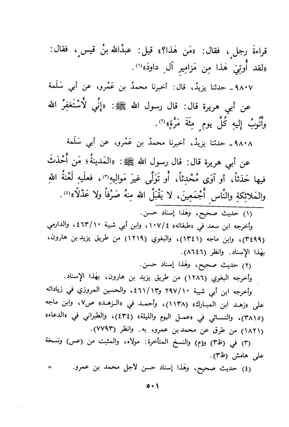 ٩٨٠٧ - حَدَّثَنَا يَزِيدُ، قَالَ: أَخْبَرَنَا مُحَمَّدُ بْنُ عَمْرٍو، عَنْ أَبِي سَلَمَةَ، عَنْ أَبِي هُرَيْرَةَ، قَالَ: قَالَ رَسُولُ اللهِ صَلَّى اللهُ عَلَيْهِ وَسَلَّمَ: " إِنِّي لَأَسْتَغْفِرُ اللهَ عَزَّ وَجَلَّ، وَأَتُوبُ إِلَيْهِ كُلَّ يَوْمٍ مِائَةَ مَرَّةٍ " (٢)