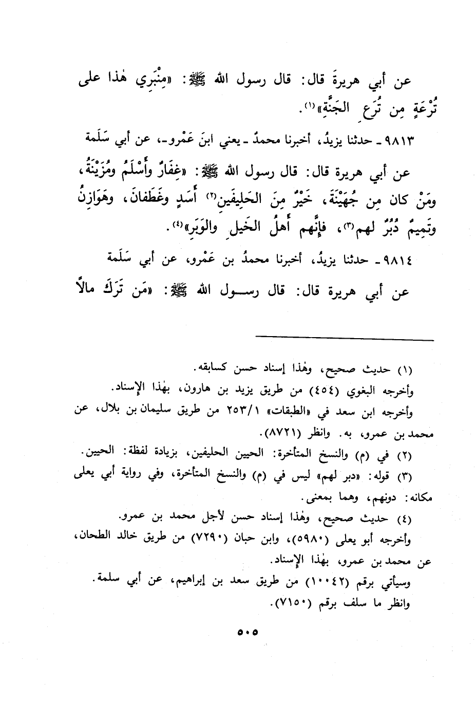 ٩٨١٣ - حَدَّثَنَا يَزِيدُ، أَخْبَرَنَا مُحَمَّدٌ يَعْنِي ابْنَ عَمْرٍو، عَنْ أَبِي سَلَمَةَ، عَنْ أَبِي هُرَيْرَةَ، قَالَ: قَالَ رَسُولُ اللهِ صَلَّى اللهُ عَلَيْهِ وَسَلَّمَ: " غِفَارُ، وَأَسْلَمُ، وَمُزَيْنَةُ، وَمَنْ كَانَ مِنْ جُهَيْنَةَ، خَيْرٌ مِنَ الْحَلِيفَيْنِ: (٢) أَسَدٍ، وَغَطَفَانَ، وَهَوَازِنَ، وَتَمِيمٍ، دَبَرَ لَهُمْ، (٣) فَإِنَّهُمْ أَهْلُ الْخَيْلِ وَالْوَبَرِ " (٤)