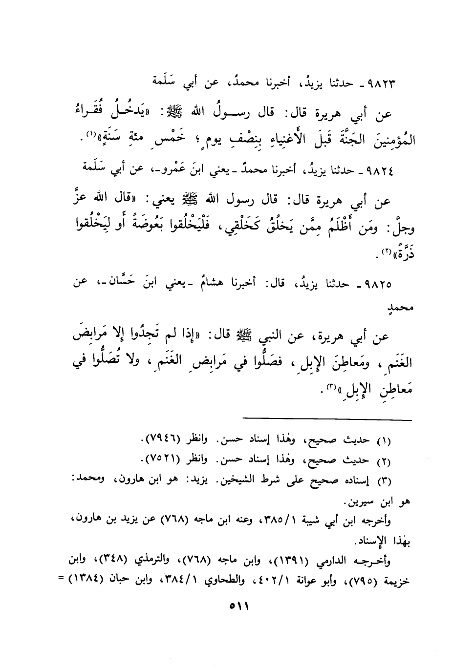 ٩٨٢٣ - حَدَّثَنَا يَزِيدُ، أَخْبَرَنَا مُحَمَّدٌ، عَنْ أَبِي سَلَمَةَ، عَنْ أَبِي هُرَيْرَةَ، قال: قَالَ رَسُولُ اللهِ صَلَّى اللهُ عَلَيْهِ وَسَلَّمَ: " يَدْخُلُ فُقَرَاءُ الْمُؤْمِنِينَ الْجَنَّةَ قَبْلَ الْأَغْنِيَاءِ بِنِصْفِ يَوْمٍ، خَمْسِ مِائَةِ سَنَةٍ " (١)