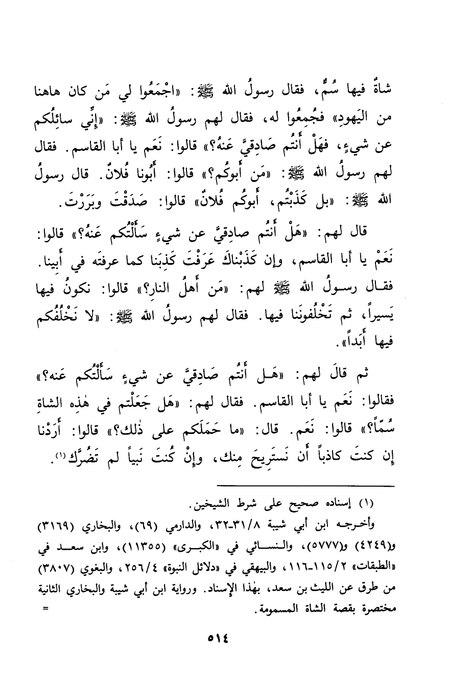 شَاةٌ فِيهَا سُمٌّ، فَقَالَ رَسُولُ اللهِ صَلَّى اللهُ عَلَيْهِ وَسَلَّمَ: " اجْمَعُوا لِي مَنْ كَانَ هَاهُنَا مِنَ الْيَهُودِ "، فَجَمَعُوا لَهُ، فَقَالَ لَهُمْ رَسُولُ اللهِ صَلَّى اللهُ عَلَيْهِ وَسَلَّمَ: " إِنِّي سَائِلُكُمْ عَنْ شَيْءٍ، فَهَلْ أَنْتُمْ صَادِقِيَّ عَنْهُ؟ " قَالُوا: نَعَمْ، يَا أَبَا الْقَاسِمِ، فَقَالَ لَهُمْ رَسُولُ اللهِ صَلَّى اللهُ عَلَيْهِ وَسَلَّمَ: " مَنْ أَبُوكُمْ؟ " قَالُوا: أَبُونَا فُلَانٌ، قَالَ رَسُولُ اللهِ صَلَّى اللهُ عَلَيْهِ وَسَلَّمَ: " بَلْ كَذَبْتُمْ، أَبُوكُمْ فُلَانٌ "، قَالُوا: صَدَقْتَ وَبَرَرْتَ، قَالَ لَهُمْ: " هَلْ أَنْتُمْ صَادِقِيَّ عَنْ شَيْءٍ سَأَلْتُكُمْ عَنْهُ؟ " قَالُوا: نَعَمْ، يَا أَبَا الْقَاسِمِ، وَإِنْ كَذَبْنَاكَ عَرَفْتَ كَذِبَنَا كَمَا عَرَفْتَهُ فِي أَبِينَا، فَقَالَ رَسُولُ اللهِ صَلَّى اللهُ عَلَيْهِ وَسَلَّمَ: " مَنْ أَهْلُ النَّارِ؟ " قَالُوا: نَكُونُ فِيهَا يَسِيرًا، ثُمَّ تَخْلُفُونَنَا فِيهَا، فَقَالَ لَهُمْ رَسُولُ اللهِ صَلَّى اللهُ عَلَيْهِ وَسَلَّمَ: " لَا نَخْلُفُكُمْ فِيهَا أَبَدًا "، ثُمَّ قَالَ لَهُمْ: " هَلْ أَنْتُمْ صَادِقِيَّ عَنْ شَيْءٍ سَأَلْتُكُمْ عَنْهُ؟ " فَقَالُوا: نَعَمْ، يَا أَبَا الْقَاسِمِ، فَقَالَ لَهُمْ: " هَلْ جَعَلْتُمْ فِي هَذِهِ الشَّاةِ سُمًّا؟ " قَالُوا: نَعَمْ، قَالَ: " مَا حَمَلَكُمْ عَلَى ذَلِكَ؟ " قَالُوا: أَرَدْنَا إِنْ كُنْتَ كَاذِبًا أَنْ نَسْتَرِيحَ مِنْكَ، وَإِنْ كُنْتَ نَبِيًّا لَمْ تَضُرَّكَ (١)