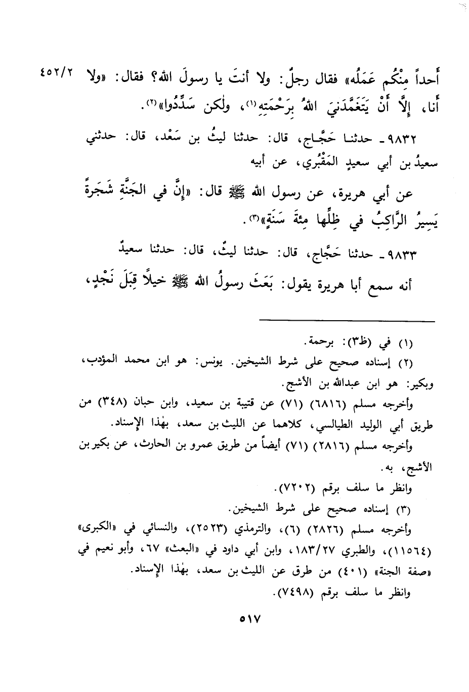 ٩٨٣٢ - حَدَّثَنَا حَجَّاجٌ، قَالَ: حَدَّثَنَا لَيْثُ بْنُ سَعْدٍ، قَالَ: حَدَّثَنِي ٣٢٨٠ سَعِيدُ بْنُ أَبِي سَعِيدٍ الْمَقْبُرِيُّ، عَنْ أَبِيهِ، عَنْ أَبِي هُرَيْرَةَ، عَنْ رَسُولِ اللهِ صَلَّى اللهُ عَلَيْهِ وَسَلَّمَ قَالَ: " إِنَّ فِي الْجَنَّةِ شَجَرَةً يَسِيرُ الرَّاكِبُ فِي ظِلِّهَا مِائَةَ سَنَةٍ " (٣)