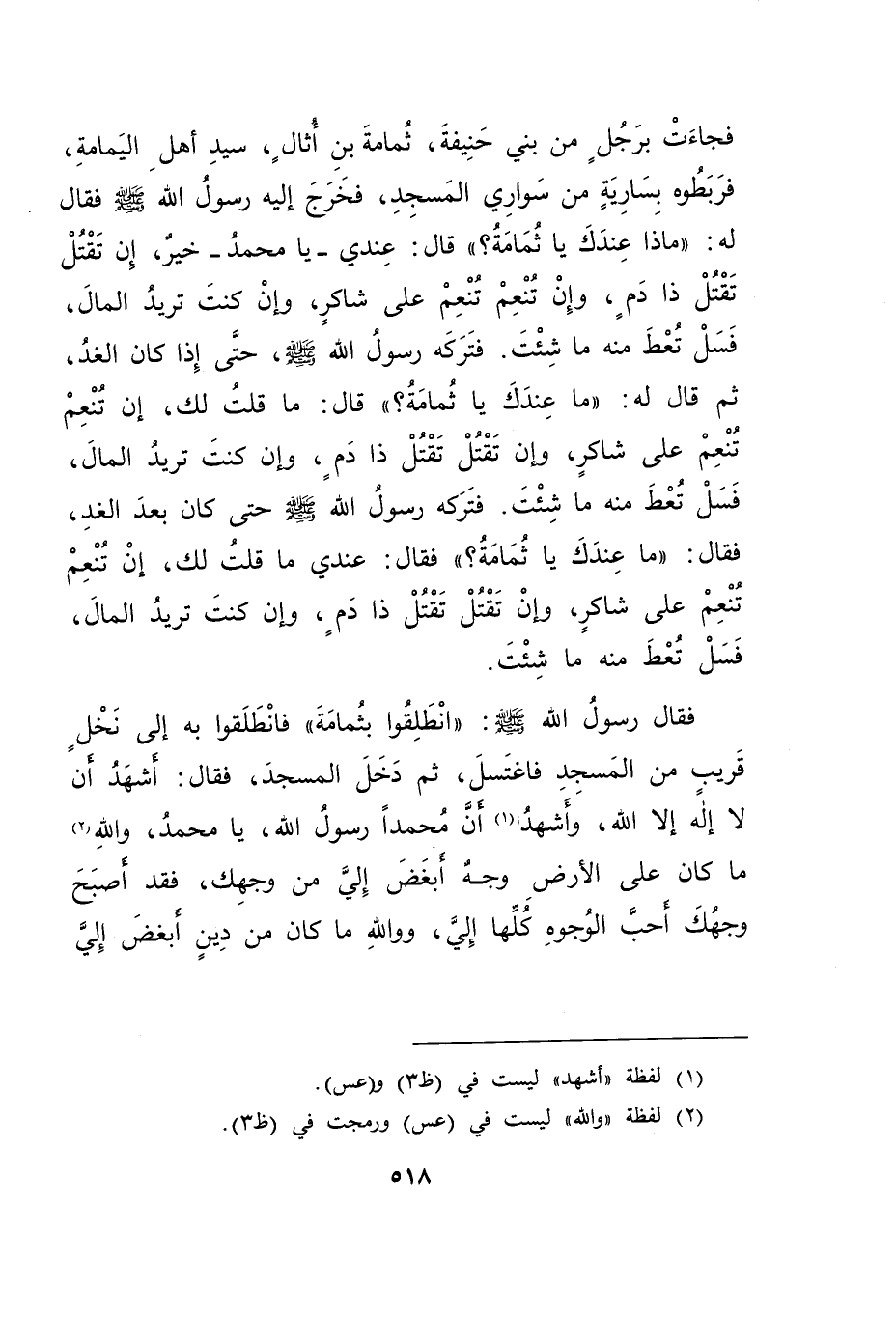 فَجَاءَتْ بِرَجُلٍ مِنْ بَنِي حَنِيفَةَ، ثُمَامَةُ بْنُ أُثَالٍ، سَيِّدُ أَهْلِ الْيَمَامَةِ، فَرَبَطُوهُ بِسَارِيَةٍ مِنْ سَوَارِي الْمَسْجِدِ، فَخَرَجَ إِلَيْهِ رَسُولُ اللهِ صَلَّى اللهُ عَلَيْهِ وَسَلَّمَ، فَقَالَ لَهُ: " مَاذَا عِنْدَكَ يَا ثُمَامَةُ؟ " قَالَ: عِنْدِي يَا مُحَمَّدُ خَيْرٌ، إِنْ تَقْتُلْ تَقْتُلْ ذَا دَمٍ، وَإِنْ تُنْعِمْ تُنْعِمْ عَلَى شَاكِرٍ، وَإِنْ كُنْتَ تُرِيدُ الْمَالَ فَسَلْ تُعْطَ مِنْهُ مَا شِئْتَ، فَتَرَكَهُ رَسُولُ اللهِ صَلَّى اللهُ عَلَيْهِ وَسَلَّمَ حَتَّى إِذَا كَانَ الْغَدُ، قَالَ لَهُ: " مَا عِنْدَكَ يَا ثُمَامَةُ؟ " قَالَ: مَا قُلْتُ لَكَ: إِنْ تُنْعِمْ تُنْعِمْ عَلَى شَاكِرٍ، وَإِنْ تَقْتُلْ تَقْتُلْ ذَا دَمٍ، وَإِنْ كُنْتَ تُرِيدُ الْمَالَ فَسَلْ تُعْطَ مِنْهُ مَا شِئْتَ، فَتَرَكَهُ رَسُولُ اللهِ صَلَّى اللهُ عَلَيْهِ وَسَلَّمَ حَتَّى كَانَ بَعْدَ الْغَدِ، فَقَالَ: " مَا عِنْدَكَ يَا ثُمَامَةُ؟ " فَقَالَ: عِنْدِي مَا قُلْتُ لَكَ: إِنْ تُنْعِمْ تُنْعِمْ عَلَى شَاكِرٍ، وَإِنْ تَقْتُلْ تَقْتُلْ ذَا دَمٍ، وَإِنْ كُنْتَ تُرِيدُ الْمَالَ فَسَلْ تُعْطَ مِنْهُ مَا شِئْتَ، فَقَالَ رَسُولُ اللهِ صَلَّى اللهُ عَلَيْهِ وَسَلَّمَ: " انْطَلِقُوا بِثُمَامَةَ "، فَانْطَلَقُوا بِهِ إِلَى نَخْلٍ قَرِيبٍ مِنَ الْمَسْجِدِ، فَاغْتَسَلَ، ثُمَّ دَخَلَ الْمَسْجِدَ، فَقَالَ: أَشْهَدُ أَنْ لَا إِلَهَ إِلَّا اللهُ، وَأَشْهَدُ (١) أَنَّ مُحَمَّدًا رَسُولُ اللهِ، يَا مُحَمَّدُ، وَاللهِ (٢) مَا كَانَ عَلَى وَجْهٌ الْأَرْضِ أَبْغَضَ إِلَيَّ مِنْ وَجْهِكَ، فَقَدْ أَصْبَحَ وَجْهُكَ أَحَبَّ الْوُجُوهِ كُلِّهَا إِلَيَّ، وْوَاللهِ مَا كَانَ مِنْ دِينٍ أَبْغَضَ إِلَيَّ