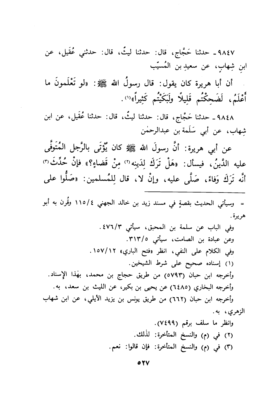 ٩٨٤٨ - حَدَّثَنَا حَجَّاجٌ، قَالَ: حَدَّثَنَا لَيْثٌ، قَالَ: حَدَّثَنَا عُقَيْلٌ، عَنِ ابْنِ شِهَابٍ، عَنْ أَبِي سَلَمَةَ بْنِ عَبْدِ الرَّحْمَنِ، عَنْ أَبِي هُرَيْرَةَ، أَنَّ رَسُولَ اللهِ صَلَّى اللهُ عَلَيْهِ وَسَلَّمَ كَانَ يُؤْتَى بِالرَّجُلِ الْمُتَوَفَّى عَلَيْهِ الدَّيْنُ، فَيَسْأَلُ: " هَلْ تَرَكَ لِدَيْنِهِ (٢) مِنْ قَضَاءٍ؟ " فَإِنْ حُدِّثَ (٣) أَنَّهُ تَرَكَ وَفَاءً، صَلَّى عَلَيْهِ، وَإِلَّا، قَالَ لِلْمُسْلِمِينَ: " صَلُّوا عَلَى