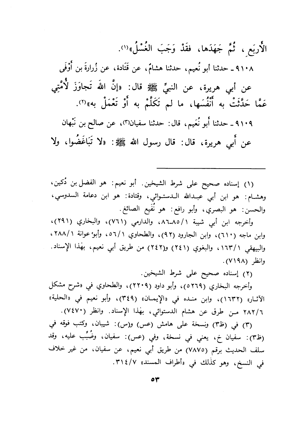 ٩١٠٨ - حَدَّثَنَا أَبُو نُعَيْمٍ، حَدَّثَنَا هِشَامٌ، عَنْ قَتَادَةَ، عَنْ زُرَارَةَ بْنِ أَوْفَى، عَنْ أَبِي هُرَيْرَةَ، عَنِ النَّبِيِّ صَلَّى اللهُ عَلَيْهِ وَسَلَّمَ قَالَ: " إِنَّ اللهَ تَجَاوَزَ لِأُمَّتِي عَمَّا حَدَّثَتْ بِهِ أَنْفُسَهَا، مَا لَمْ تُكَلِّمْ بِهِ أَوْ تَعْمَلْ بِهِ " (٢)