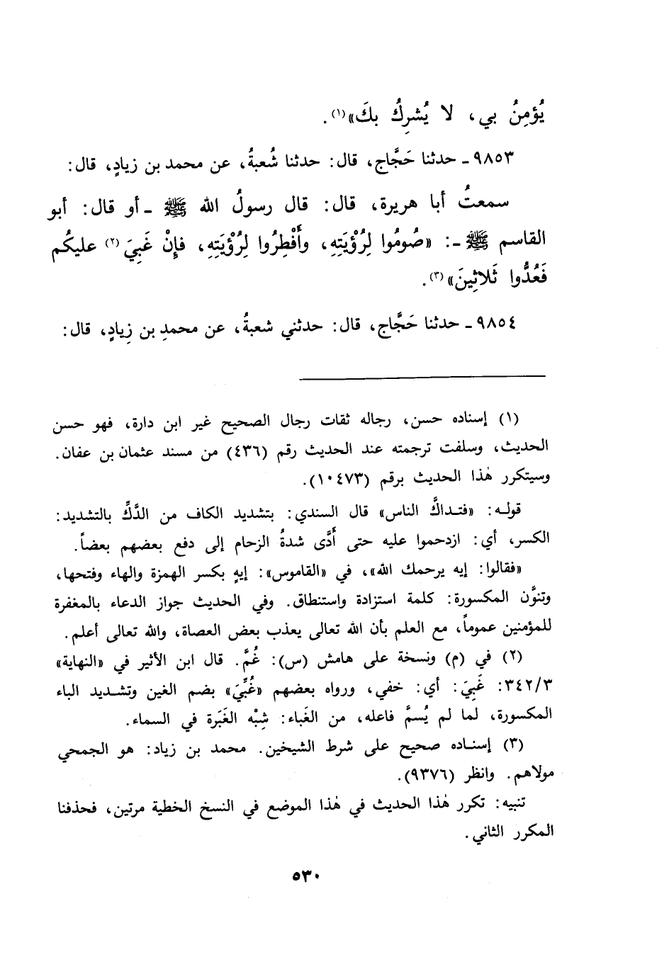 ٩٨٥٣ - حَدَّثَنَا حَجَّاجٌ، قَالَ: حَدَّثَنَا شُعْبَةُ، عَنْ مُحَمَّدِ بْنِ زِيَادٍ، قَالَ: سَمِعْتُ أَبَا هُرَيْرَةَ، قَالَ: قَالَ رَسُولُ اللهِ صَلَّى اللهُ عَلَيْهِ وَسَلَّمَ - أَوْ قَالَ أَبُو الْقَاسِمِ صَلَّى اللهُ عَلَيْهِ وَسَلَّمَ -: " صُومُوا لِرُؤْيَتِهِ، وَأَفْطِرُوا لِرُؤْيَتِهِ، فَإِنْ غُبِيَ (٢) عَلَيْكُمْ فَعُدُّوا ثَلَاثِينَ " (٣)