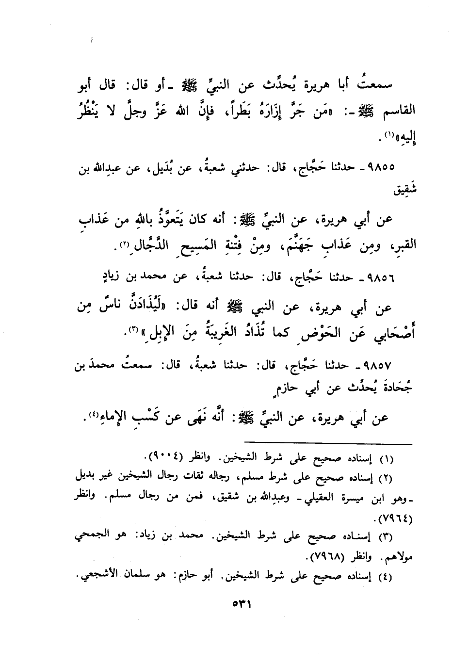 سَمِعْتُ أَبَا هُرَيْرَةَ، يُحَدِّثُ عَنِ النَّبِيِّ صَلَّى اللهُ عَلَيْهِ وَسَلَّمَ، - أَوْ قَالَ: قَالَ أَبُو الْقَاسِمِ صَلَّى اللهُ عَلَيْهِ وَسَلَّمَ -: " مَنْ جَرَّ إِزَارَهُ بَطَرًا، فَإِنَّ اللهَ عَزَّ وَجَلَّ لَا يَنْظُرُ إِلَيْهِ " (١)
