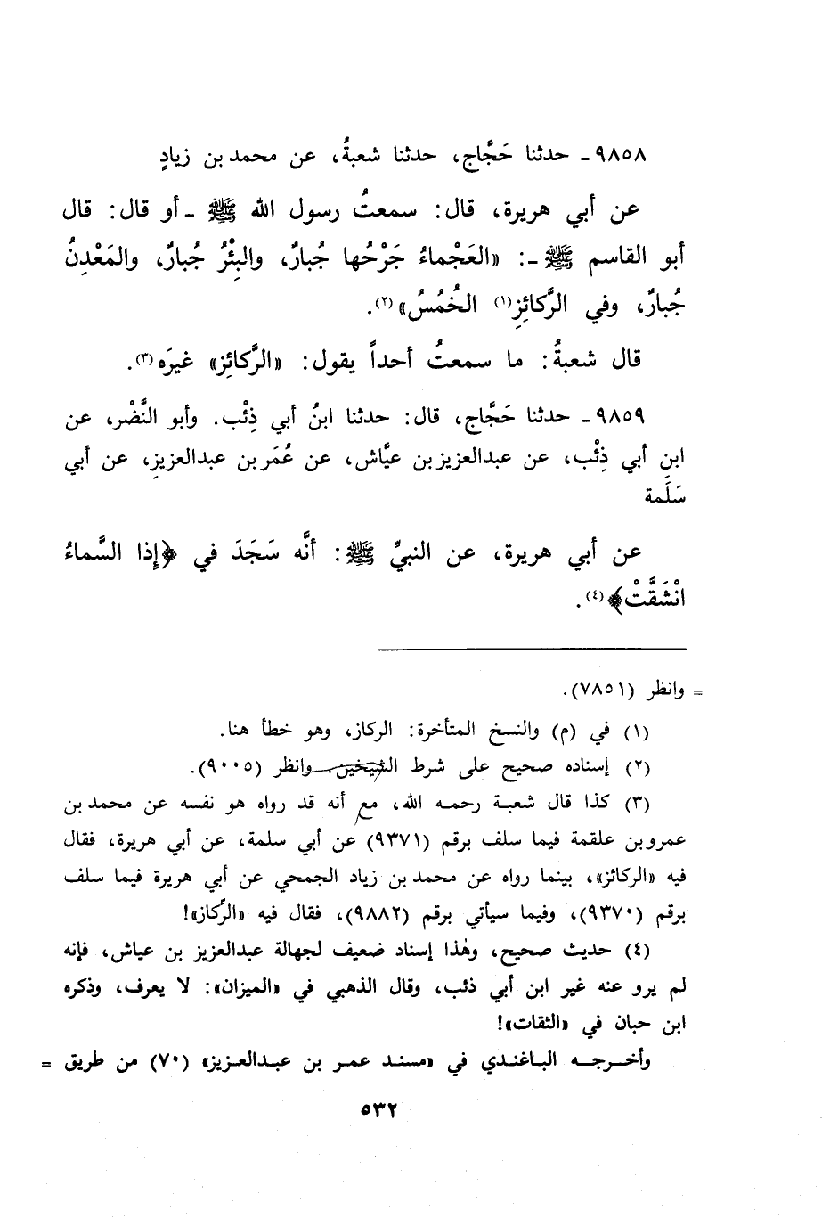 (٣) كذا قال شعبة رحمه الله، مع أنه قد رواه هو نفسه عن محمد بن عمرو بن علقمة فيما سلف برقم (٩٣٧١) عن أبي سلمة، عن أبي هريرة، فقال فيه "الركائز"، بينما رواه عن محمد بن زياد الجمحي عن أبي هريرة فيما سلف برقم (٩٣٧٠) ، وفيما سيأتي برقم (٩٨٨٢) ، فقال فيه "الركاز"!