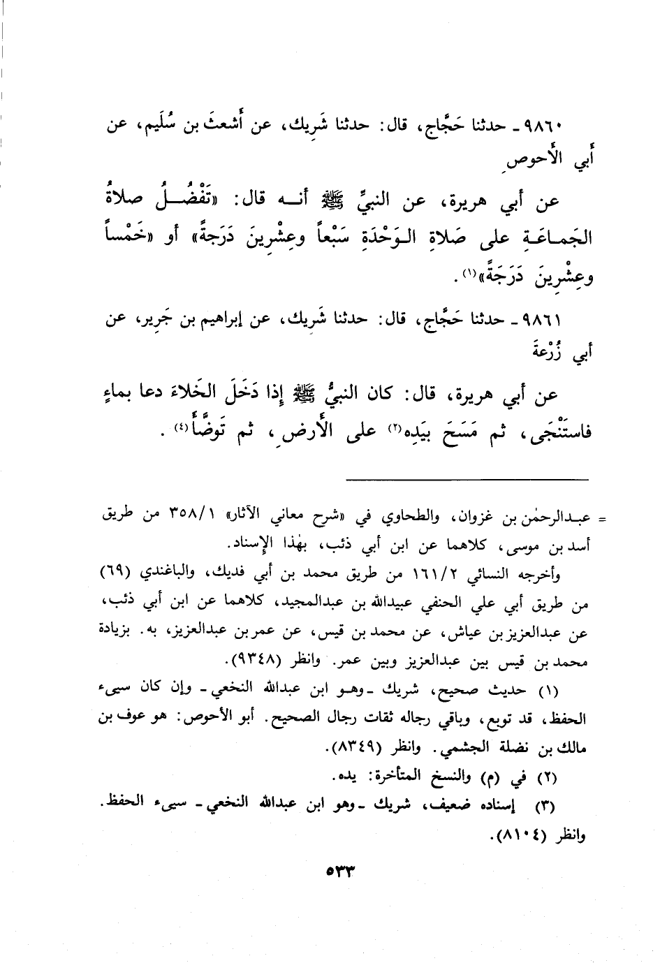 ٩٨٦٠ - حَدَّثَنَا حَجَّاجٌ، قَالَ: حَدَّثَنَا شَرِيكٌ، عَنْ أَشْعَثَ بْنِ سُلَيْمٍ، عَنْ أَبِي الْأَحْوَصِ، عَنْ أَبِي هُرَيْرَةَ، عَنِ النَّبِيِّ صَلَّى اللهُ عَلَيْهِ وَسَلَّمَ أَنَّهُ قَالَ: " تَفْضُلُ صَلَاةُ الْجَمَاعَةِ عَلَى صَلَاةِ الْوَحْدَةِ سَبْعًا وَعِشْرِينَ دَرَجَةً، أَوْ خَمْسًا وَعِشْرِينَ دَرَجَةً " (١)