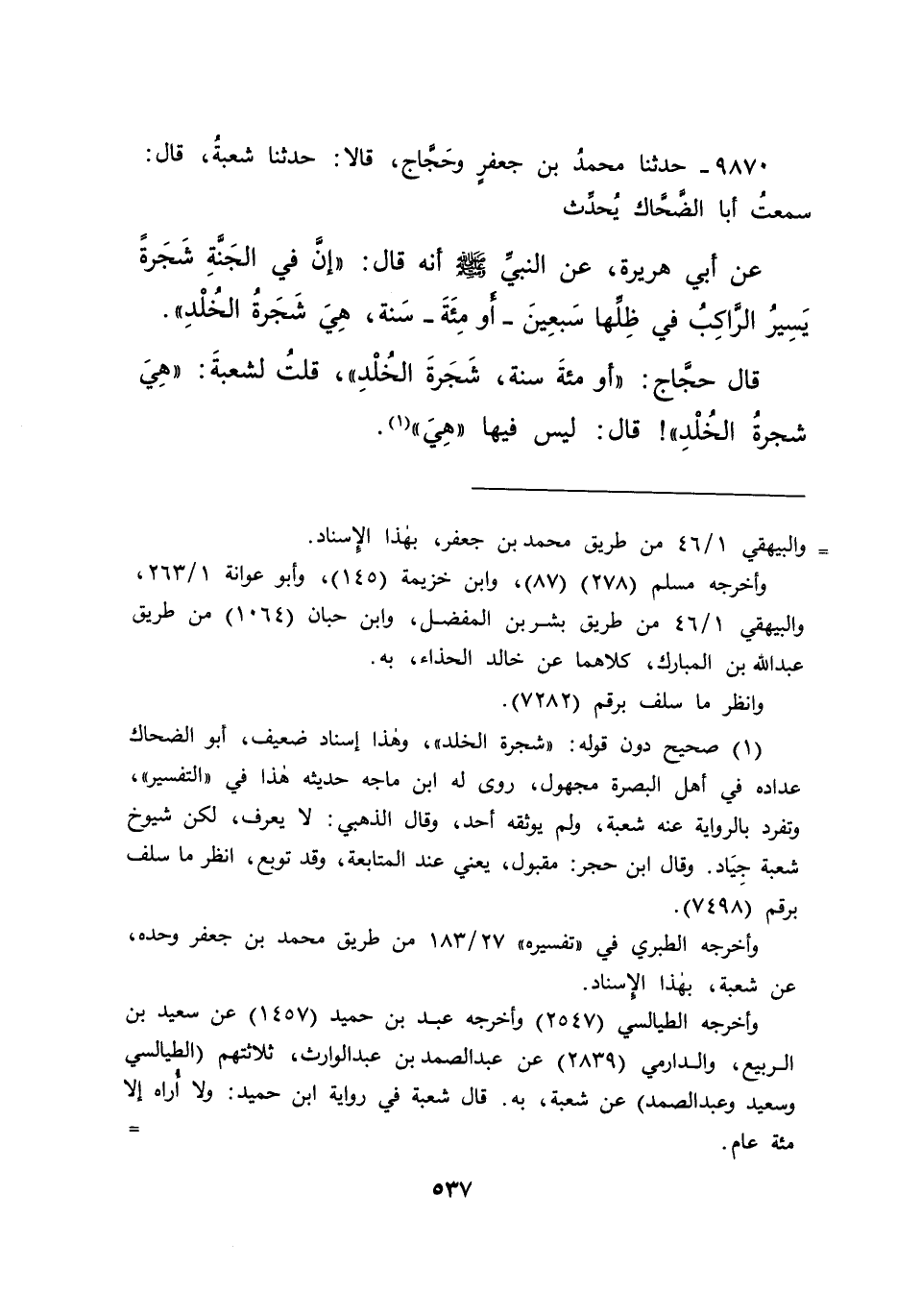 ٩٨٧٠ - حَدَّثَنَا مُحَمَّدُ بْنُ جَعْفَرٍ، وَحَجَّاجٌ، قَالَا: حَدَّثَنَا شُعْبَةُ، قَالَ: سَمِعْتُ أَبَا الضَّحَّاكِ، يُحَدِّثُ عَنْ أَبِي هُرَيْرَةَ، عَنِ النَّبِيِّ صَلَّى اللهُ عَلَيْهِ وَسَلَّمَ أَنَّهُ قَالَ: " إِنَّ فِي الْجَنَّةِ شَجَرَةً يَسِيرُ الرَّاكِبُ فِي ظِلِّهَا سَبْعِينَ - أَوْ مِائَةَ سَنَةٍ - هِيَ شَجَرَةُ الْخُلْدِ "، قَالَ حَجَّاجٌ: " أَوْ مِائَةَ سَنَةٍ، شَجَرَةُ الْخُلْدِ "، قُلْتُ لِشُعْبَةَ: هِيَ شَجَرَةُ الْخُلْدِ قَالَ: " لَيْسَ فِيهَا، هِيَ " (١)