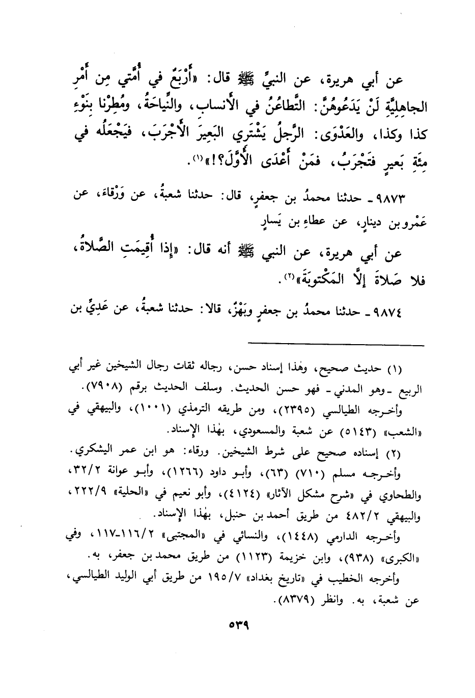 ٩٨٧٤ - حَدَّثَنَا مُحَمَّدُ بْنُ جَعْفَرٍ، وَبَهْزٌ، قَالَا: حَدَّثَنَا شُعْبَةُ، عَنْ عَدِيِّ بْنِ