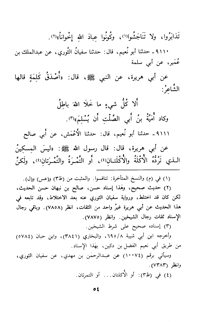 ٩١١٠ - حَدَّثَنَا أَبُو نُعَيْمٍ، قَالَ: حَدَّثَنَا سُفْيَانُ الثَّوْرِيُّ، عَنْ عَبْدِ الْمَلِكِ بْنِ عُمَيْرٍ، عَنْ أَبِي سَلَمَةَ، عَنْ أَبِي هُرَيْرَةَ، عَنِ النَّبِيِّ صَلَّى اللهُ عَلَيْهِ وَسَلَّمَ قَالَ: " أَصْدَقُ كَلِمَةٍ قَالَهَا الشَّاعِرُ: