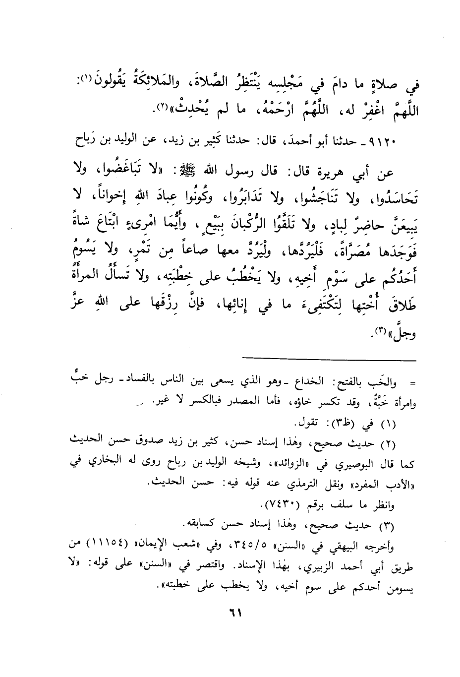 ٩١٢٠ - حَدَّثَنَا أَبُو أَحْمَدَ، قَالَ: حَدَّثَنَا كَثِيرُ بْنُ زَيْدٍ، عَنِ الْوَلِيدِ بْنِ رَبَاحٍ، عَنْ أَبِي هُرَيْرَةَ، قَالَ: قَالَ رَسُولُ اللهِ صَلَّى اللهُ عَلَيْهِ وَسَلَّمَ: " لَا تَبَاغَضُوا، وَلَا تَحَاسَدُوا، وَلَا تَنَاجَشُوا، وَلَا تَدَابَرُوا، وَكُونُوا عِبَادَ اللهِ إِخْوَانًا "