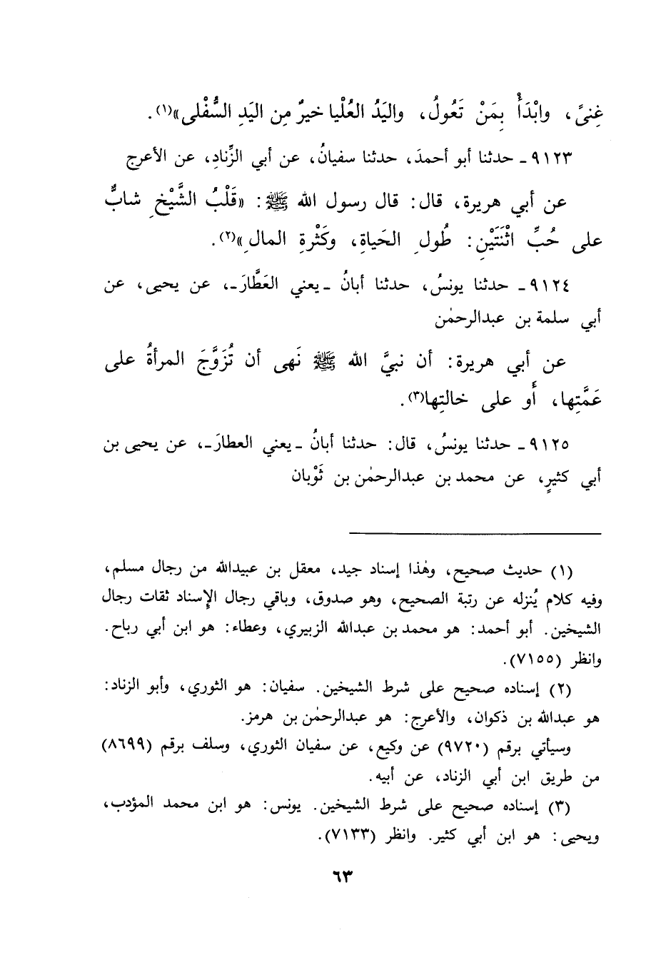 ٩١٢٣ - حَدَّثَنَا أَبُو أَحْمَدَ، حَدَّثَنَا سُفْيَانُ، عَنْ أَبِي الزِّنَادِ، عَنِ الْأَعْرَجِ، عَنْ أَبِي هُرَيْرَةَ، قَالَ: قَالَ رَسُولُ اللهِ صَلَّى اللهُ عَلَيْهِ وَسَلَّمَ: " قَلْبُ الشَّيْخِ شَابٌّ عَلَى حُبِّ اثْنَتَيْنِ: طُولِ الْحَيَاةِ، وَكَثْرَةِ الْمَالِ " (٢)