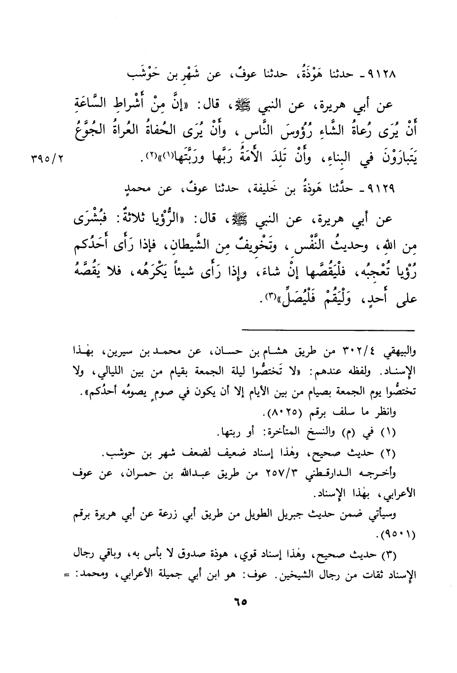 ٩١٢٨ - حَدَّثَنَا هَوْذَةُ، حَدَّثَنَا عَوْفٌ، عَنْ شَهْرِ بْنِ حَوْشَبٍ، عَنْ أَبِي هُرَيْرَةَ، عَنِ النَّبِيِّ صَلَّى اللهُ عَلَيْهِ وَسَلَّمَ قَالَ: " إن مِنْ أَشْرَاطِ السَّاعَةِ أَنْ يُرَى رُعَاةُ الشَّاءِ رُءُوسَ النَّاسِ، وَأَنْ يُرَى الْحُفَاةُ الْعُرَاةُ الْجُوَّعُ يَتَبَارَوْنَ فِي الْبِنَاءِ، وَأَنْ تَلِدَ الْأَمَةُ رَبَّهَا، وَرَبَّتَهَا (١) " (٢)