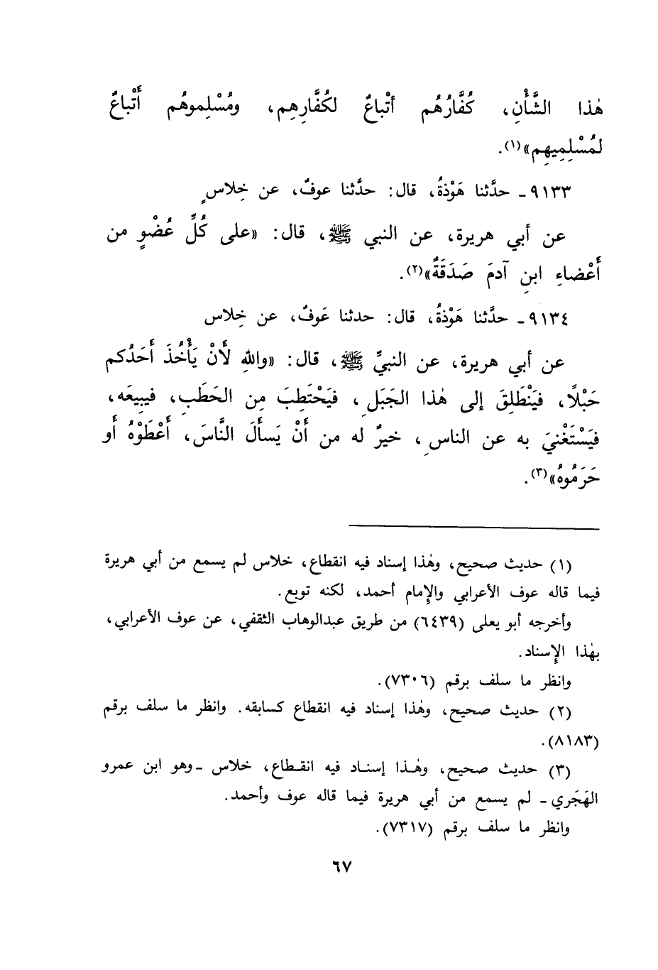 ٩١٣٤ - حَدَّثَنَا هَوْذَةُ، قَالَ: حَدَّثَنَا عَوْفٌ، عَنْ خِلَاسٍ، عَنْ أَبِي هُرَيْرَةَ، عَنِ النَّبِيِّ صَلَّى اللهُ عَلَيْهِ وَسَلَّمَ قَالَ: " وَاللهِ، لَأَنْ يَأْخُذَ أَحَدُكُمْ حَبْلًا، فَيَنْطَلِقَ إِلَى هَذَا الْجَبَلِ، فَيَحْتَطِبَ مِنَ الْحَطَبِ، فيَبِيعَهُ، فيَسْتَغْنِيَ بِهِ عَنِ النَّاسِ، خَيْرٌ لَهُ مِنْ أَنْ يَسْأَلَ النَّاسَ، أَعْطَوْهُ أَوْ حَرَمُوهُ " (٣)