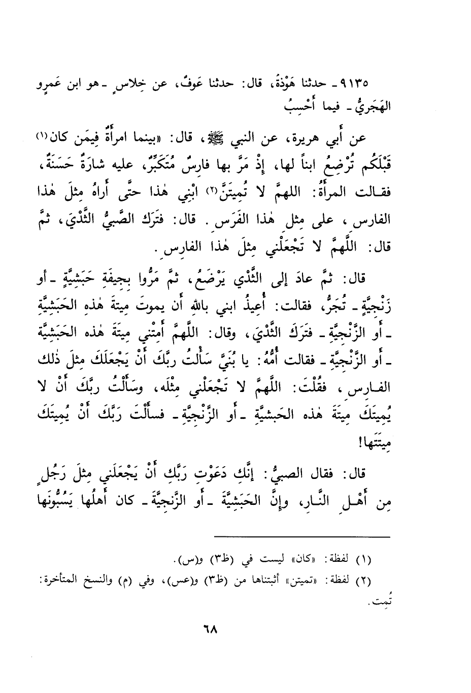 ٩١٣٥ - حَدَّثَنَا هَوْذَةُ، قَالَ: حَدَّثَنَا عَوْفٌ، عَنْ خِلَاسٍ هُوَ ابْنُ عَمْرٍو الْهَجَرِيُّ، فِيمَا أَحْسَبُ عَنْ أَبِي هُرَيْرَةَ، عَنِ النَّبِيِّ صَلَّى اللهُ عَلَيْهِ وَسَلَّمَ قَالَ: " بَيْنَمَا امْرَأَةٌ فِيمَنْ كَانَ (١) قَبْلَكُمْ تُرْضِعُ ابْنًا لَهَا، إِذْ مَرَّ بِهَا فَارِسٌ مُتَكَبِّرٌ، عَلَيْهِ شَارَةٌ حَسَنَةٌ، فَقَالَتِ الْمَرْأَةُ: اللهُمَّ، لَا تُمِيتَنَّ (٢) ابْنِي هَذَا حَتَّى أَرَاهُ مِثْلَ هَذَا الْفَارِسِ عَلَى مِثْلِ هَذَا الْفَرَسِ "، قَالَ: " فَتَرَكَ الصَّبِيُّ الثَّدْيَ، ثُمَّ قَالَ: اللهُمَّ، لَا تَجْعَلْنِي مِثْلَ هَذَا الْفَارِسِ "، قَالَ: " ثُمَّ عَادَ إِلَى الثَّدْيِ يَرْضَعُ، ثُمَّ مَرُّوا بِجِيفَةٍ حَبَشِيَّةٍ أَوْ زِنْجِيَّةٍ تُجَرُّ، فَقَالَتْ: أُعِيذُ ابْنِي بِاللهِ أَنْ يَمُوتَ مِيتَةَ هَذِهِ الْحَبَشِيَّةِ أَوِ الزِّنْجِيَّةِ، فَتَرَكَ الثَّدْيَ، وَقَالَ: اللهُمَّ، أَمِتْنِي مِيتَةَ هَذِهِ الْحَبَشِيَّةِ أَوِ الزِّنْجِيَّةِ، فَقَالَتْ أُمُّهُ: يَا بُنَيَّ، سَأَلْتُ رَبَّكَ أَنْ يَجْعَلَكَ مِثْلَ ذَلِكَ الْفَارِسِ، فَقُلْتَ: اللهُمَّ، لَا تَجْعَلْنِي مِثْلَهُ، وَسَأَلْتُ رَبَّكَ أَلَّا يُمِيتَكَ مِيتَةَ هَذِهِ الْحَبَشِيَّةِ أَوِ الزِّنْجِيَّةِ، فَسَأَلْتَ رَبَّكَ أَنْ يُمِيتَكَ مِيتَتَهَا "، قَالَ: " فَقَالَ الصَّبِيُّ: إِنَّكِ دَعَوْتِ رَبَّكِ أَنْ يَجْعَلَنِي مِثْلَ رَجُلٍ مِنْ أَهْلِ النَّارِ، وَإِنَّ الْحَبَشِيَّةَ أَوِ الزِّنْجِيَّةَ كَانَ أَهْلُهَا يَسُبُّونَهَا،