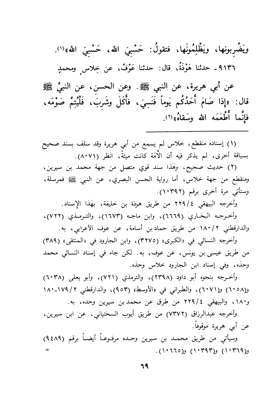 ٩١٣٦ - حَدَّثَنَا هَوْذَةُ، قَالَ: حَدَّثَنَا عَوْفٌ، عَنْ خِلَاسٍ، وَمُحَمَّدٍ، عَنْ أَبِي هُرَيْرَةَ، عَنِ النَّبِيِّ صَلَّى اللهُ عَلَيْهِ وَسَلَّمَ، وَعَنِ الْحَسَنِ، عَنِ النَّبِيِّ صَلَّى اللهُ عَلَيْهِ وَسَلَّمَ قَالَ: " إِذَا صَامَ أَحَدُكُمْ يَوْمًا فَنَسِيَ، فَأَكَلَ وَشَرِبَ، فَلْيُتِمَّ صَوْمَهُ، فَإِنَّمَا أَطْعَمَهُ اللهُ وَسَقَاهُ " (٢)