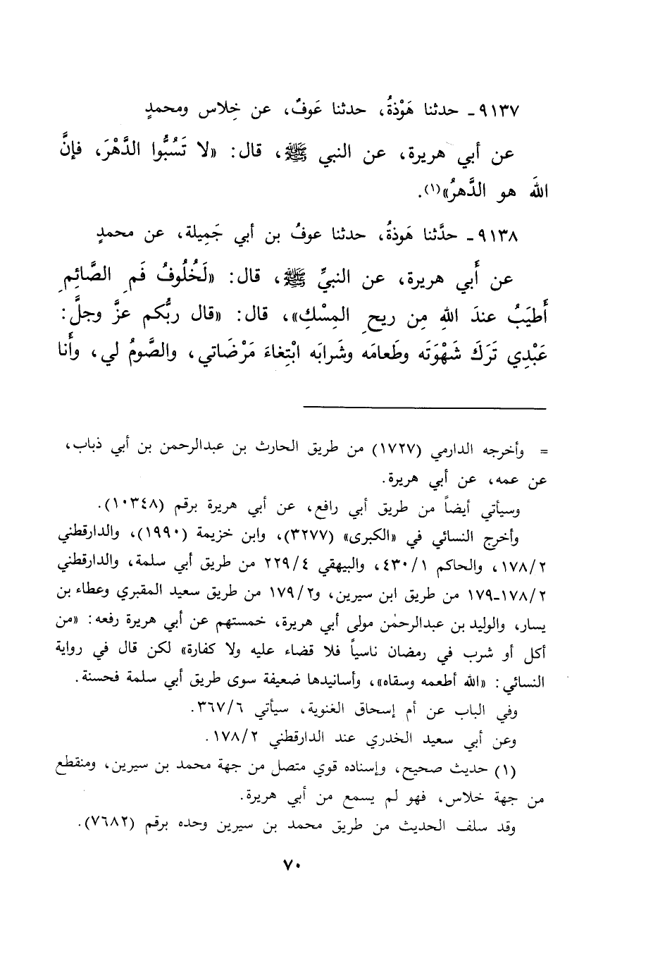 ٩١٣٨ - حَدَّثَنَا هَوْذَةُ، حَدَّثَنَا عَوْفُ بْنُ أَبِي جَمِيلَةَ، عَنْ مُحَمَّدٍ، عَنْ أَبِي هُرَيْرَةَ، عَنِ النَّبِيِّ صَلَّى اللهُ عَلَيْهِ وَسَلَّمَ قَالَ: " لَخُلُوفُ فَمِ الصَّائِمِ أَطْيَبُ عِنْدَ اللهِ مِنْ رِيحِ الْمِسْكِ "
