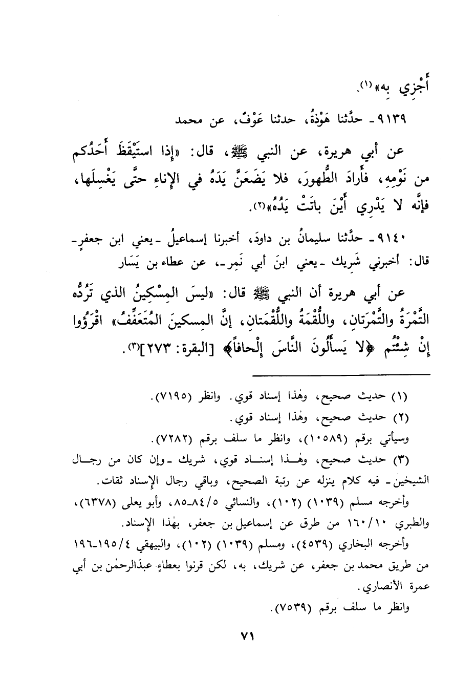 ٩١٣٩ - حَدَّثَنَا هَوْذَةُ، حَدَّثَنَا عَوْفٌ، عَنْ مُحَمَّدٍ، عَنْ أَبِي هُرَيْرَةَ، عَنِ النَّبِيِّ صَلَّى اللهُ عَلَيْهِ وَسَلَّمَ قَالَ: " إِذَا اسْتَيْقَظَ أَحَدُكُمْ مِنْ نَوْمِهِ فَأَرَادَ الطُّهُورَ، فَلَا يَضَعَنَّ يَدَهُ فِي الْإِنَاءِ حَتَّى يَغْسِلَهَا، فَإِنَّهُ لَا يَدْرِي أَيْنَ بَاتَتْ يَدُهُ " (٢)