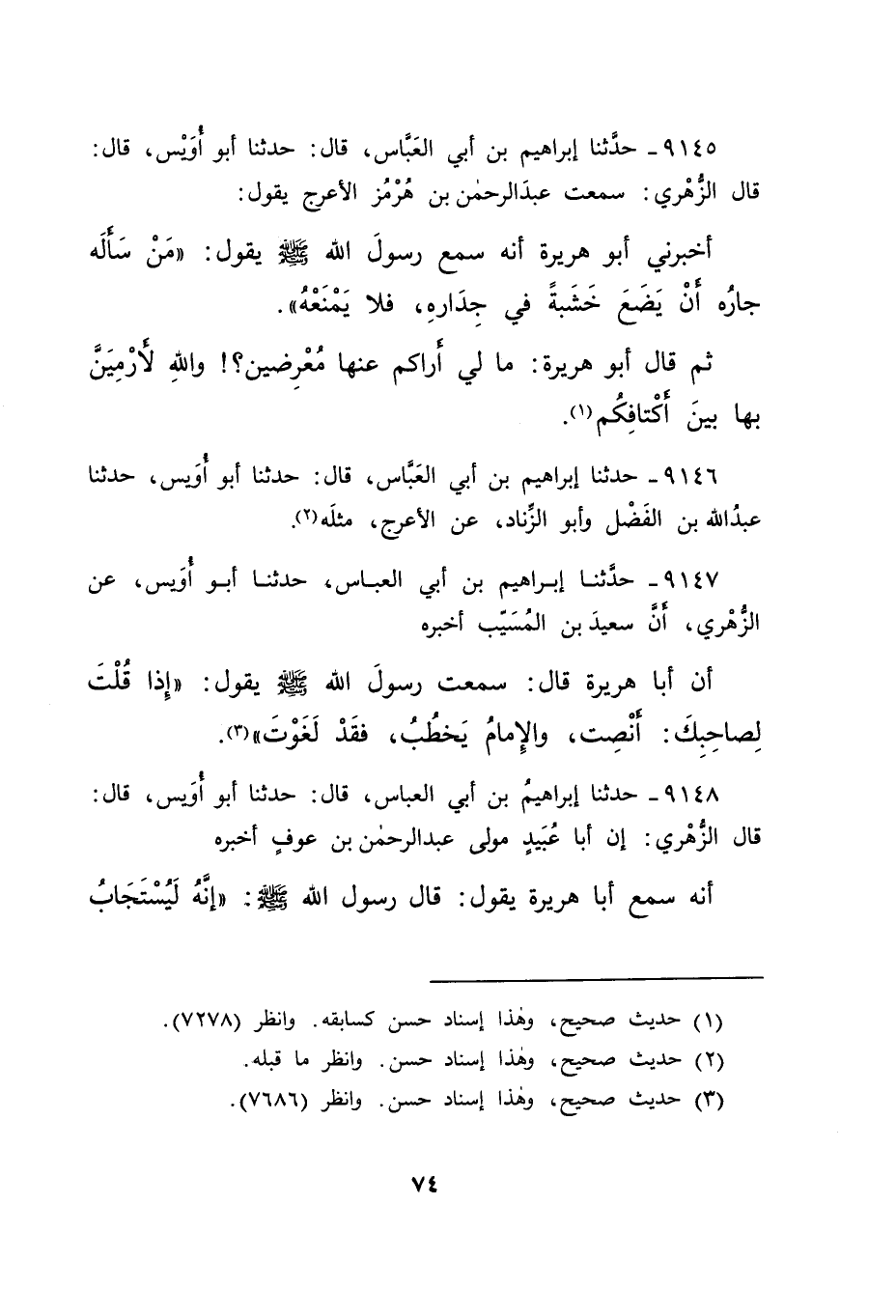 ٩١٤٥ - حَدَّثَنَا إِبْرَاهِيمُ بْنُ أَبِي الْعَبَّاسِ، قَالَ: حَدَّثَنَا أَبُو أُوَيْسٍ، قَالَ: قَالَ الزُّهْرِيُّ: سَمِعْتُ عَبْدَ الرَّحْمَنِ بْنَ هُرْمُزَ الْأَعْرَجَ، يَقُولُ: أَخْبَرَنِي أَبُو هُرَيْرَةَ، أَنَّهُ سَمِعَ رَسُولَ اللهِ صَلَّى اللهُ عَلَيْهِ وَسَلَّمَ يَقُولُ: " مَنْ سَأَلَهُ جَارَهُ أَنْ يَضَعَ خَشَبَةً فِي جِدَارِهِ فَلَا يَمْنَعْهُ " ثُمَّ قَالَ أَبُو هُرَيْرَةَ: مَا لِي أَرَاكُمْ عَنْهَا مُعْرِضِينَ، وَاللهِ لَأَرْمِيَنَّ بِهَا بَيْنَ أَكْتَافِكُمْ، (١)
