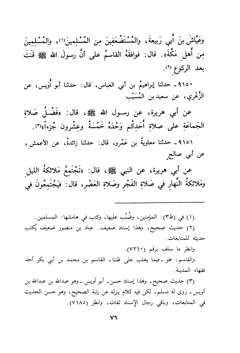 وَعَيَّاشَ بْنَ أَبِي رَبِيعَةَ، وَالْمُسْتَضْعَفِينَ مِنَ الْمُسْلِمِينَ (١) ، وَالْمُسْلِمِينَ مِنْ أَهْلِ مَكَّةَ "، قَالَ: فَوَافَقَهُ الْقَاسِمُ عَلَى أَنَّ رَسُولَ اللهِ صَلَّى اللهُ عَلَيْهِ وَسَلَّمَ قَنَتَ بَعْدَ الرُّكُوعِ (٢)
