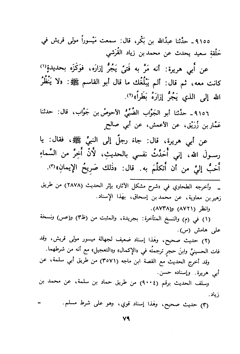 ٩١٥٦ - حَدَّثَنَا أَبُو الْجَوَّابِ الضَّبِّيُّ الْأَحْوَصُ بْنُ جَوَّابٍ، قَالَ: حَدَّثَنَا عَمَّارُ بْنُ زُرَيْقٍ، عَنِ الْأَعْمَشِ، عَنْ أَبِي صَالِحٍ، عَنْ أَبِي هُرَيْرَةَ، قَالَ: جَاءَ رَجُلٌ إِلَى النَّبِيِّ صَلَّى اللهُ عَلَيْهِ وَسَلَّمَ، فَقَالَ: يَا رَسُولَ اللهِ، إِنِّي أُحَدِّثُ نَفْسِي بِالْحَدِيثِ، لَأَنْ أَخِرَّ مِنَ السَّمَاءِ أَحَبُّ إِلَيَّ مِنْ أَنْ أَتَكَلَّمَ بِهِ، قَالَ: " ذَلِكَ صَرِيحُ الْإِيمَانِ " (٣)