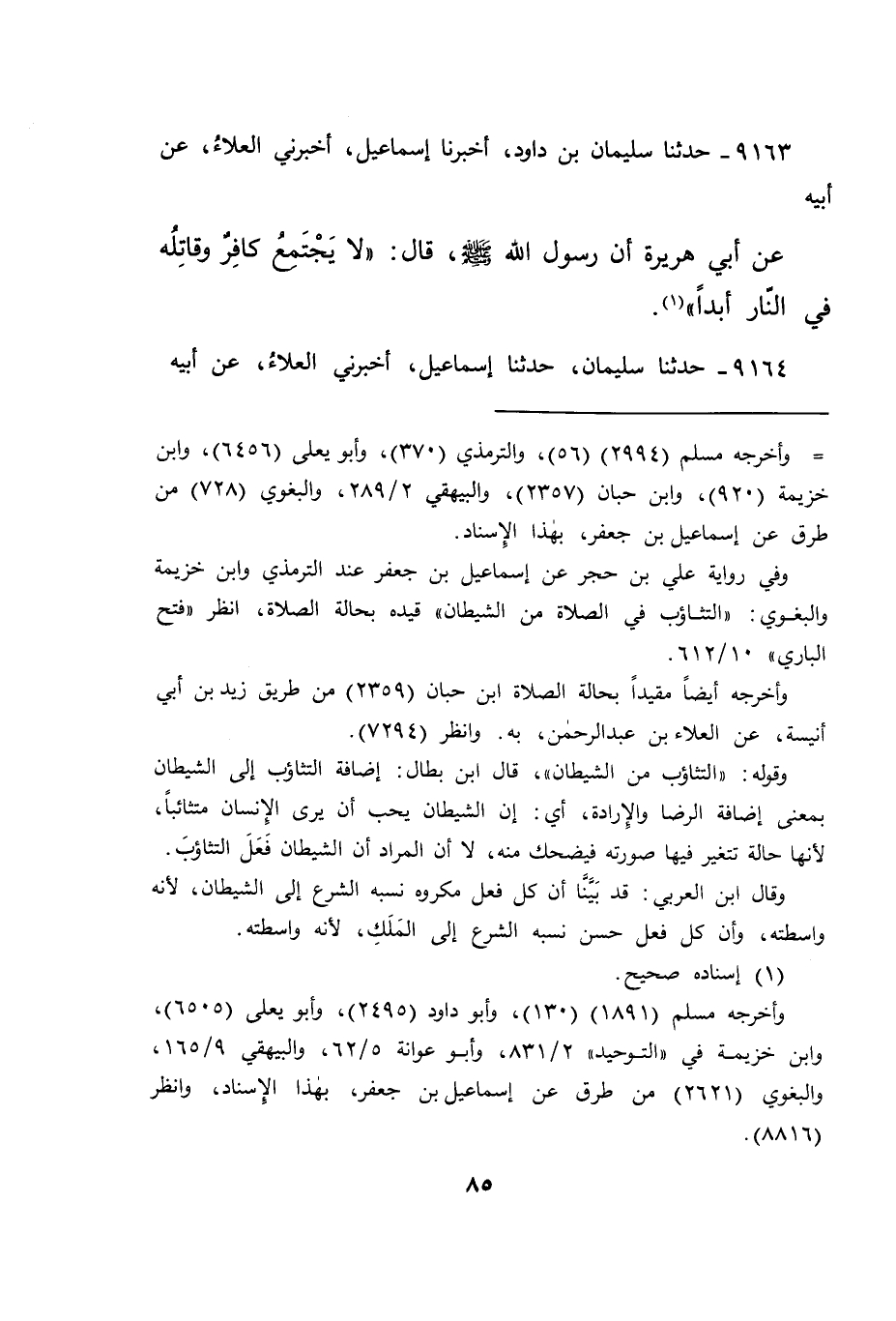 ٩١٦٣ - حَدَّثَنَا سُلَيْمَانُ بْنُ دَاوُدَ، أَخْبَرَنَا إِسْمَاعِيلُ، أَخْبَرَنِي الْعَلَاءُ، عَنْ أَبِيهِ، عَنْ أَبِي هُرَيْرَةَ أَنَّ رَسُولَ اللهِ صَلَّى اللهُ عَلَيْهِ وَسَلَّمَ قَالَ: " لَا يَجْتَمِعُ كَافِرٌ وَقَاتِلُهُ فِي النَّارِ أَبَدًا " (١)