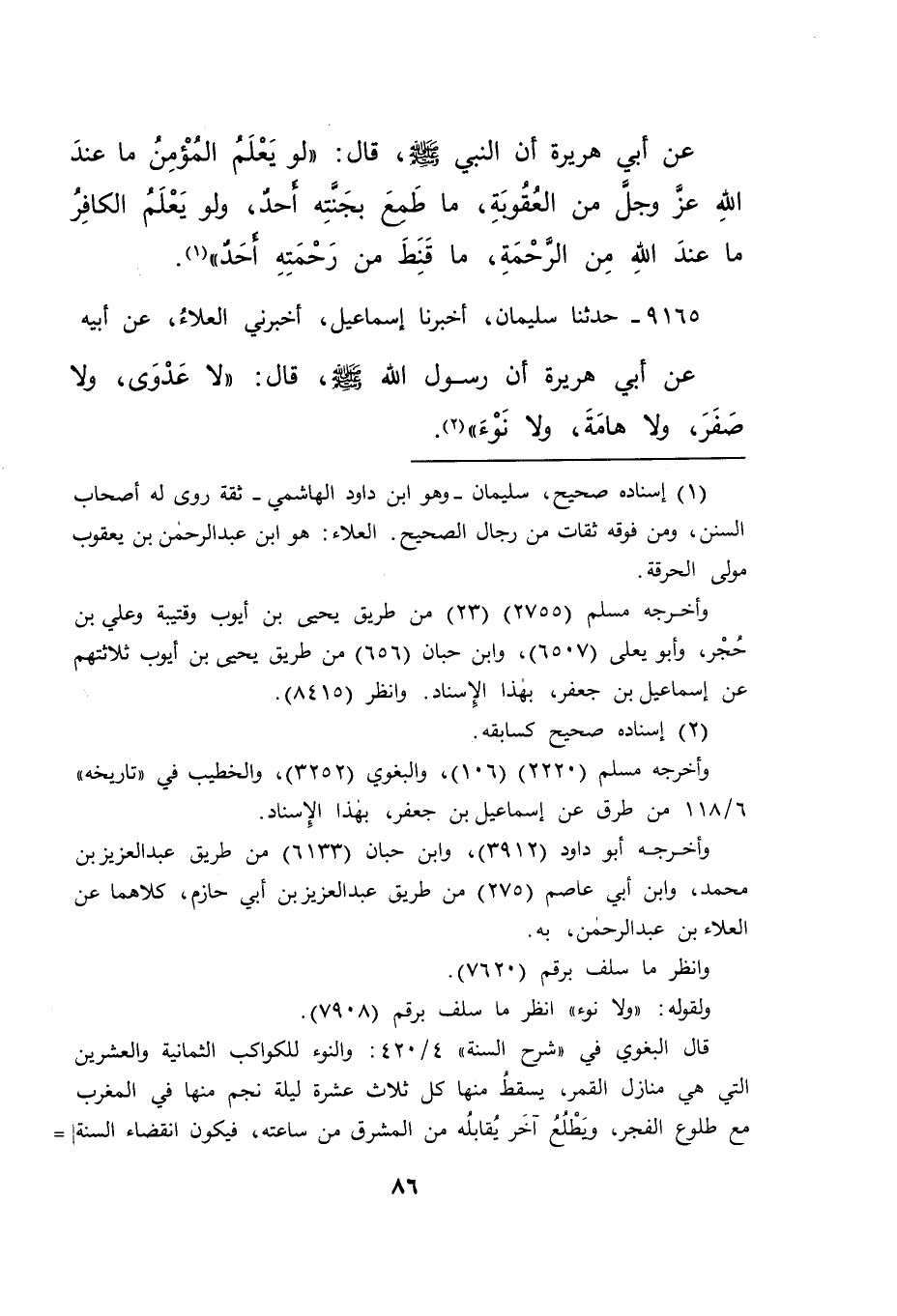 ٩١٦٥ - حَدَّثَنَا سُلَيْمَانُ، أَخْبَرَنَا إِسْمَاعِيلُ، أَخْبَرَنِي الْعَلَاءُ، عَنْ أَبِيهِ، عَنْ أَبِي هُرَيْرَةَ، أَنَّ رَسُولَ اللهِ صَلَّى اللهُ عَلَيْهِ وَسَلَّمَ قَالَ: " لَا عَدْوَى، وَلَا صَفَرَ، وَلَا هَامَةَ، وَلَا نَوْءَ " (٢)