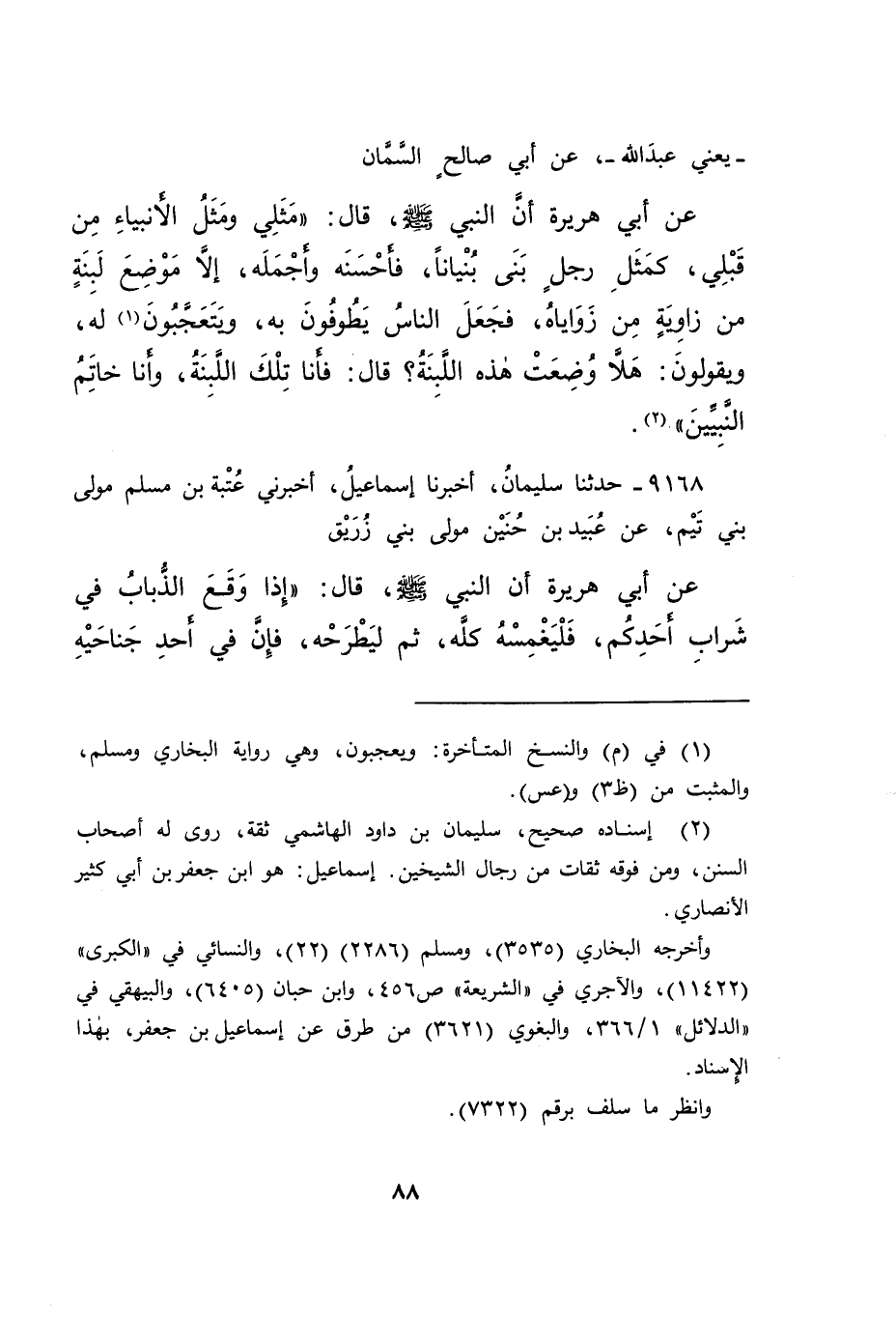 يَعْنِي عَبْدَ اللهِ، عَنْ أَبِي صَالِحٍ السَّمَّانِ، عَنْ أَبِي هُرَيْرَةَ، أَنَّ النَّبِيَّ صَلَّى اللهُ عَلَيْهِ وَسَلَّمَ قَالَ: " مَثَلِي وَمَثَلُ الْأَنْبِيَاءِ مِنْ قَبْلِي كَمَثَلِ رَجُلٍ بَنَى بُنْيَانًا فَأَحْسَنَهُ وَأَجْمَلَهُ، إِلَّا مَوْضِعَ لَبِنَةٍ مِنْ زَاوِيَةٍ مِنْ زَوَايَاهُ، فَجَعَلَ النَّاسُ يَطُوفُونَ بِهِ، وَيتَعَجَّبُونَ (١) لَهُ، وَيَقُولُونَ: هَلَّا وُضِعَتْ هَذِهِ اللَّبِنَةُ، قَالَ: فَأَنَا تِلْكَ اللَّبِنَةُ وَأَنَا خَاتَمُ النَّبِيِّينَ " (٢)