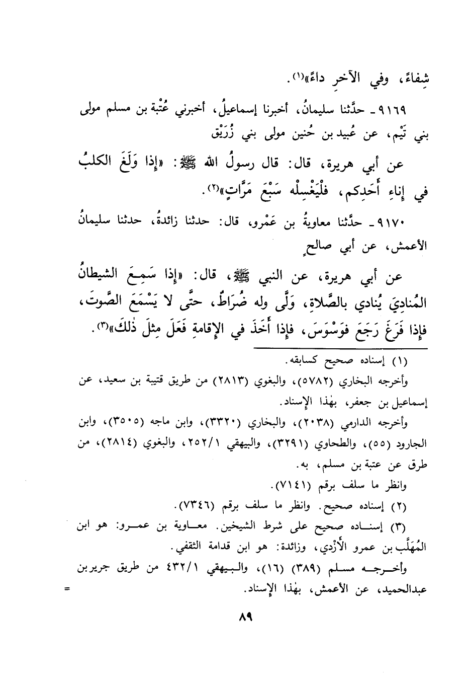 ٩١٦٩ - حَدَّثَنَا سُلَيْمَانُ، أخبرنا إِسْمَاعِيلُ، أَخْبَرَني عُتْبَةُ بْنُ مُسْلِمٍ، مَوْلَى بَنِي تَيْمٍ، عَنْ عُبَيْدِ بْنِ حُنَيْنٍ، مَوْلَى بَنِي زُرَيْقٍ، عَنْ أَبِي هُرَيْرَةَ قال: قَالَ رَسُولُ اللهِ صَلَّى اللهُ عَلَيْهِ وَسَلَّمَ: " إِذَا وَلَغَ الْكَلْبُ فِي إِنَاءِ أَحَدِكُمْ فَلْيَغْسِلْهُ سَبْعَ مَرَّاتٍ " (٢)